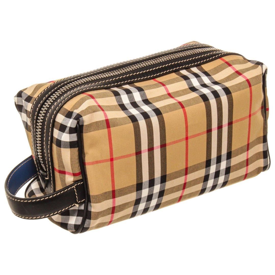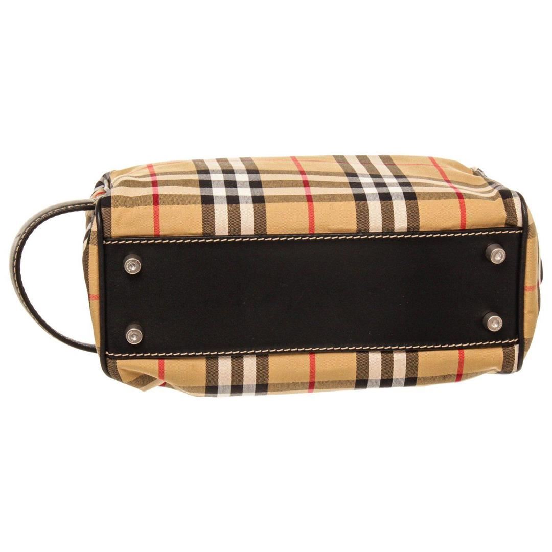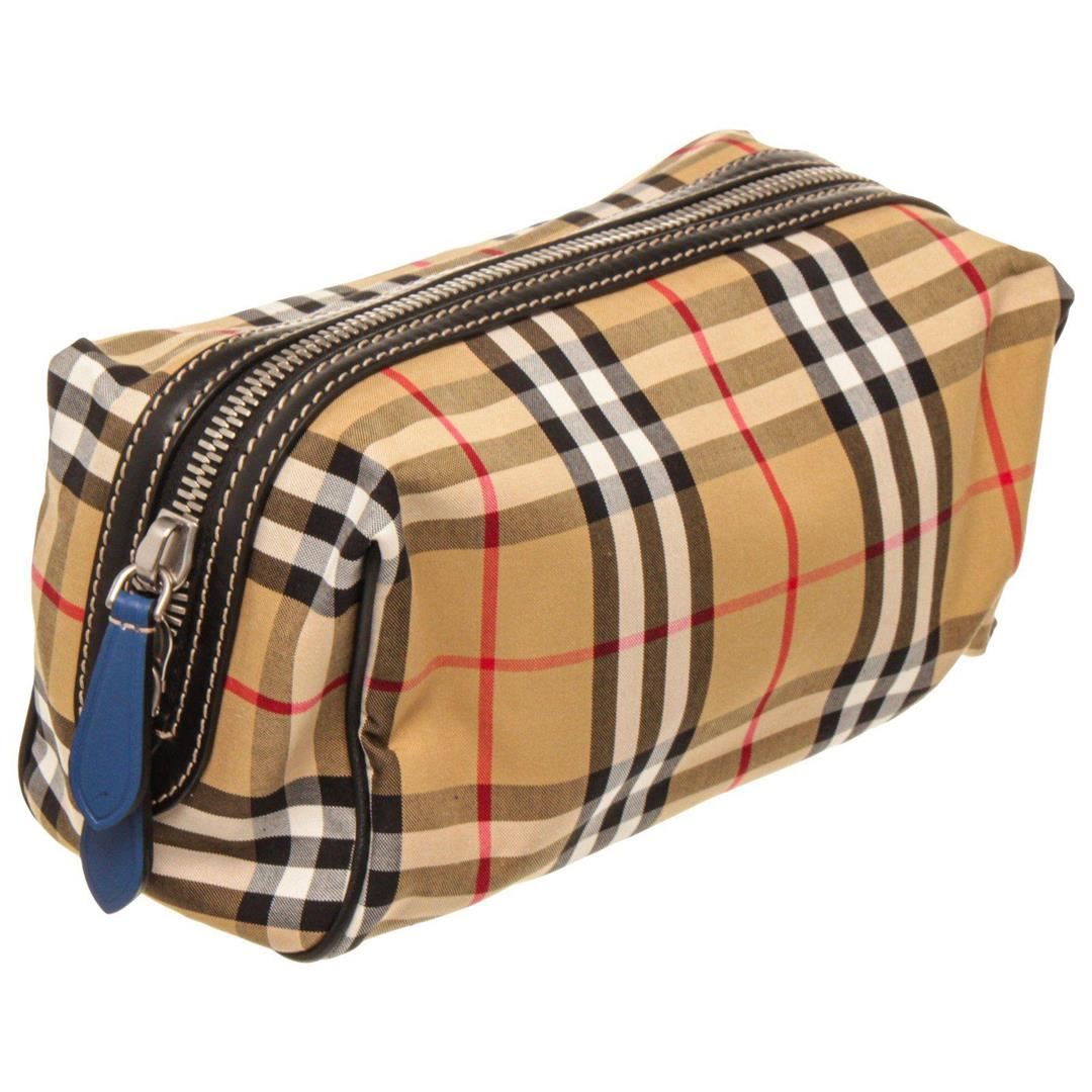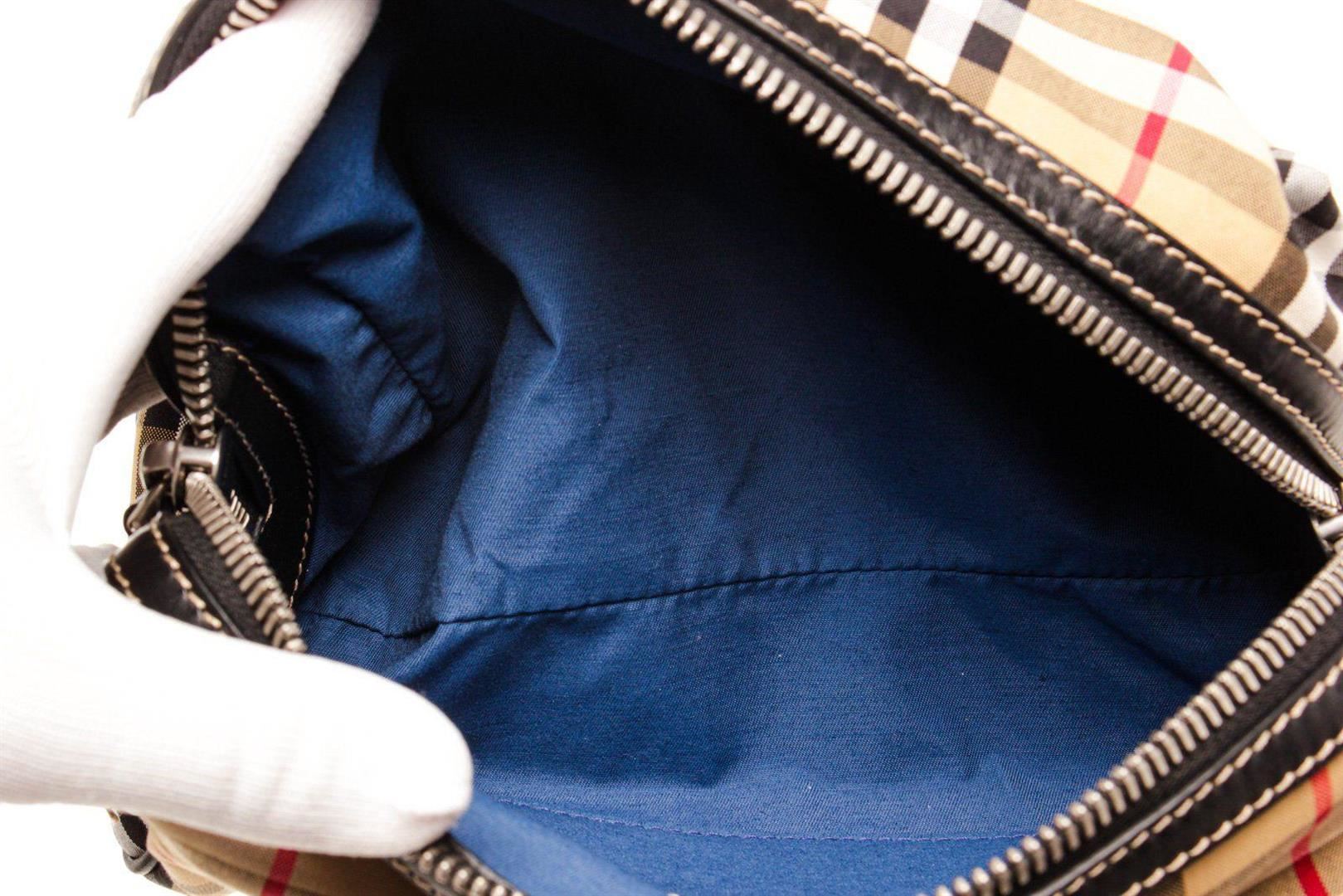 Burberry Tan Patent Leather Cosmetic Pouch with patent leather trim, silver-tone hardware, interior zip pocket, front exterior flap pocket with snap closure, zip top closure, adjustable patent leather shoulder strap.