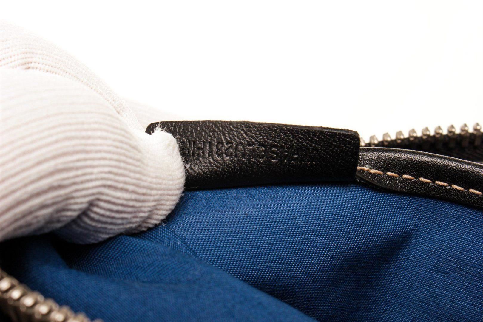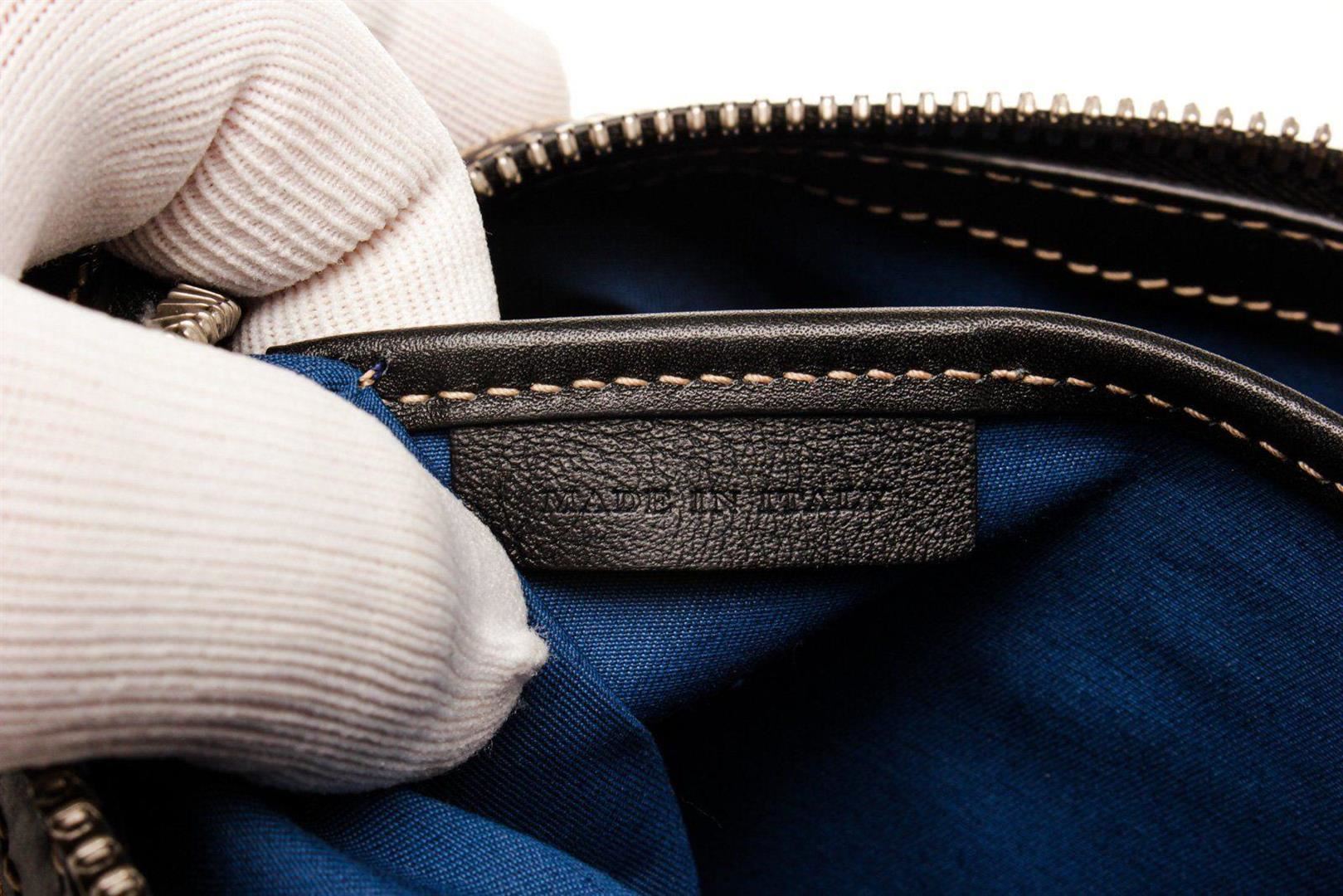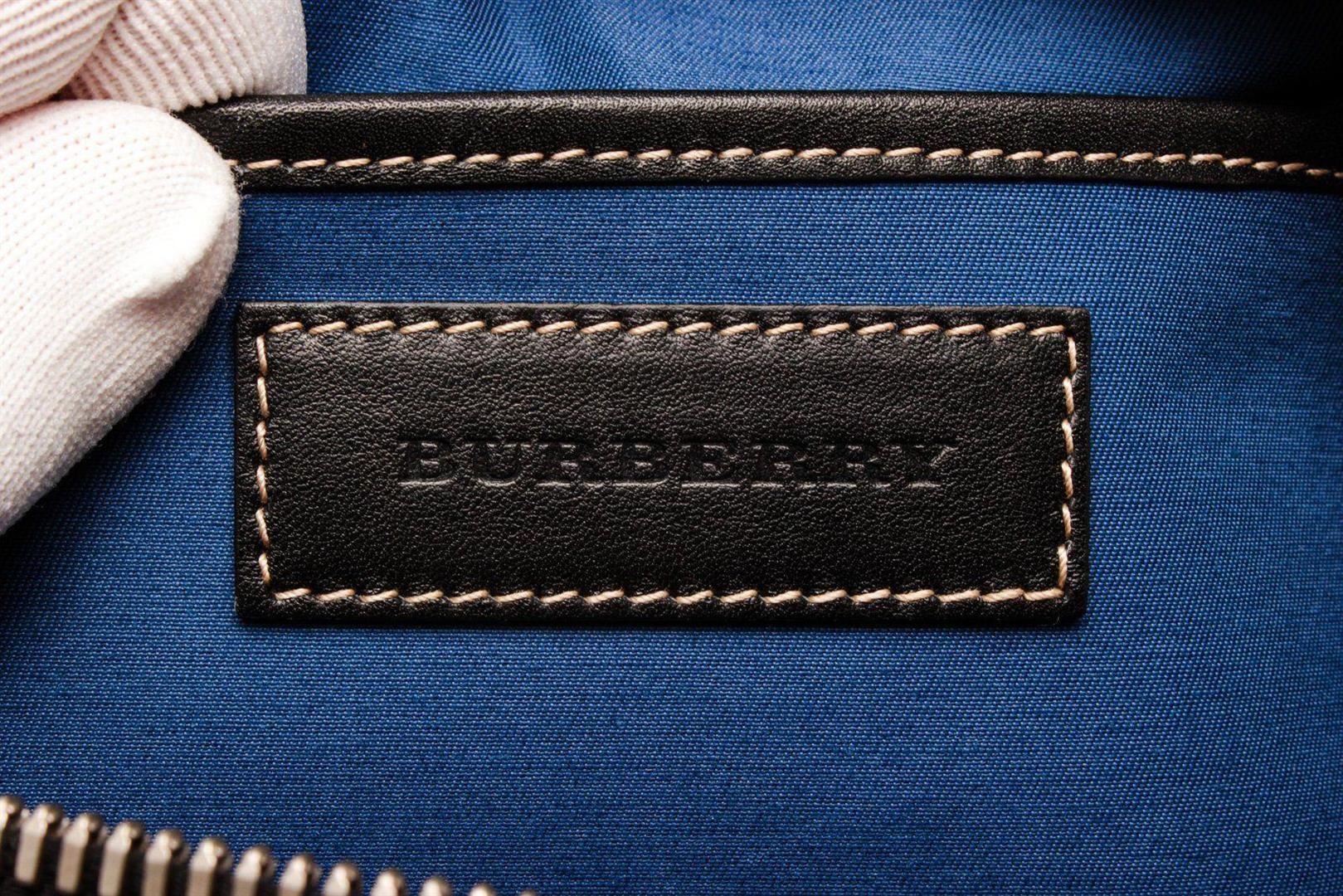 Burberry Tan Patent Leather Cosmetic Pouch with patent leather trim, silver-tone hardware, interior zip pocket, front exterior flap pocket with snap closure, zip top closure, adjustable patent leather shoulder strap.