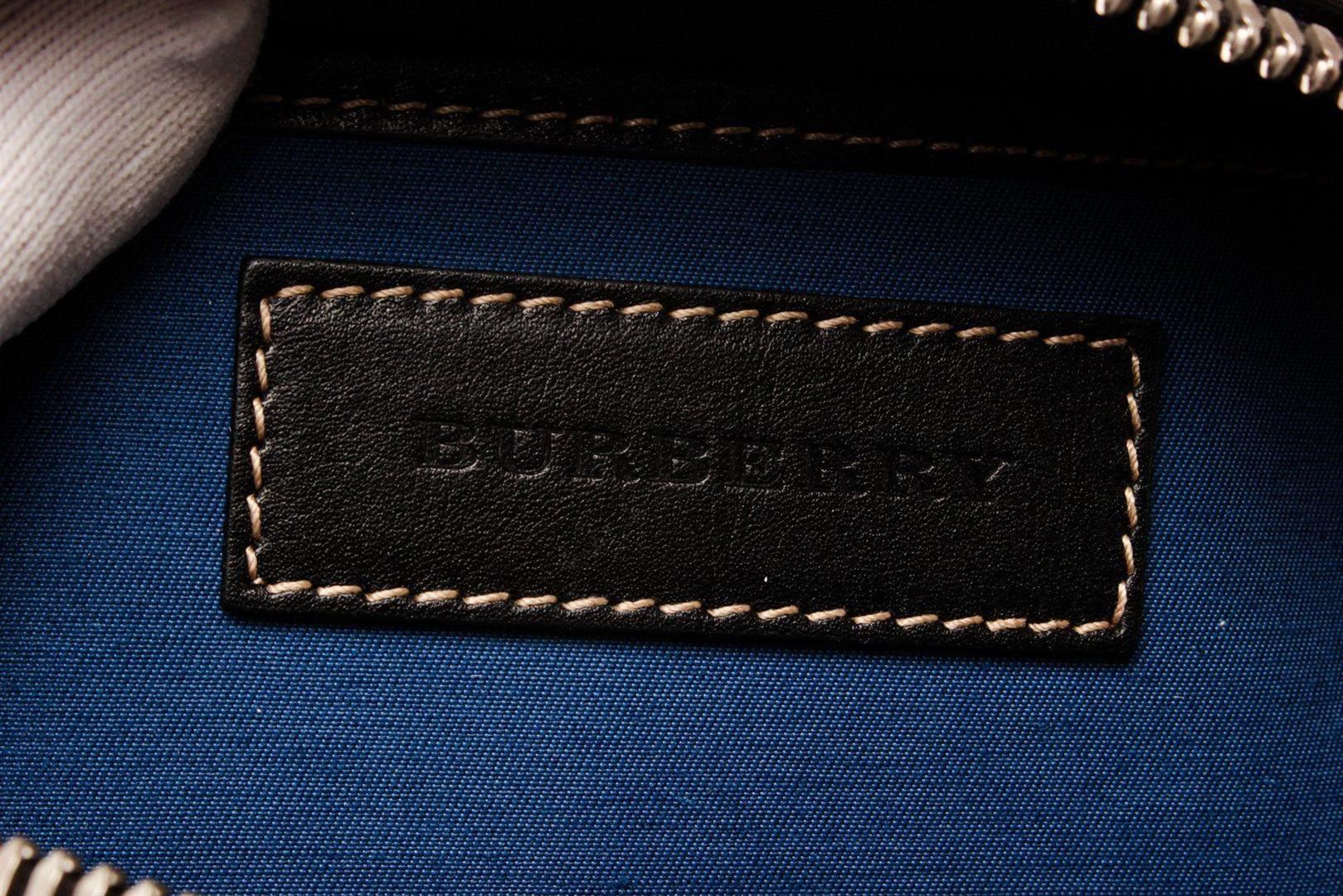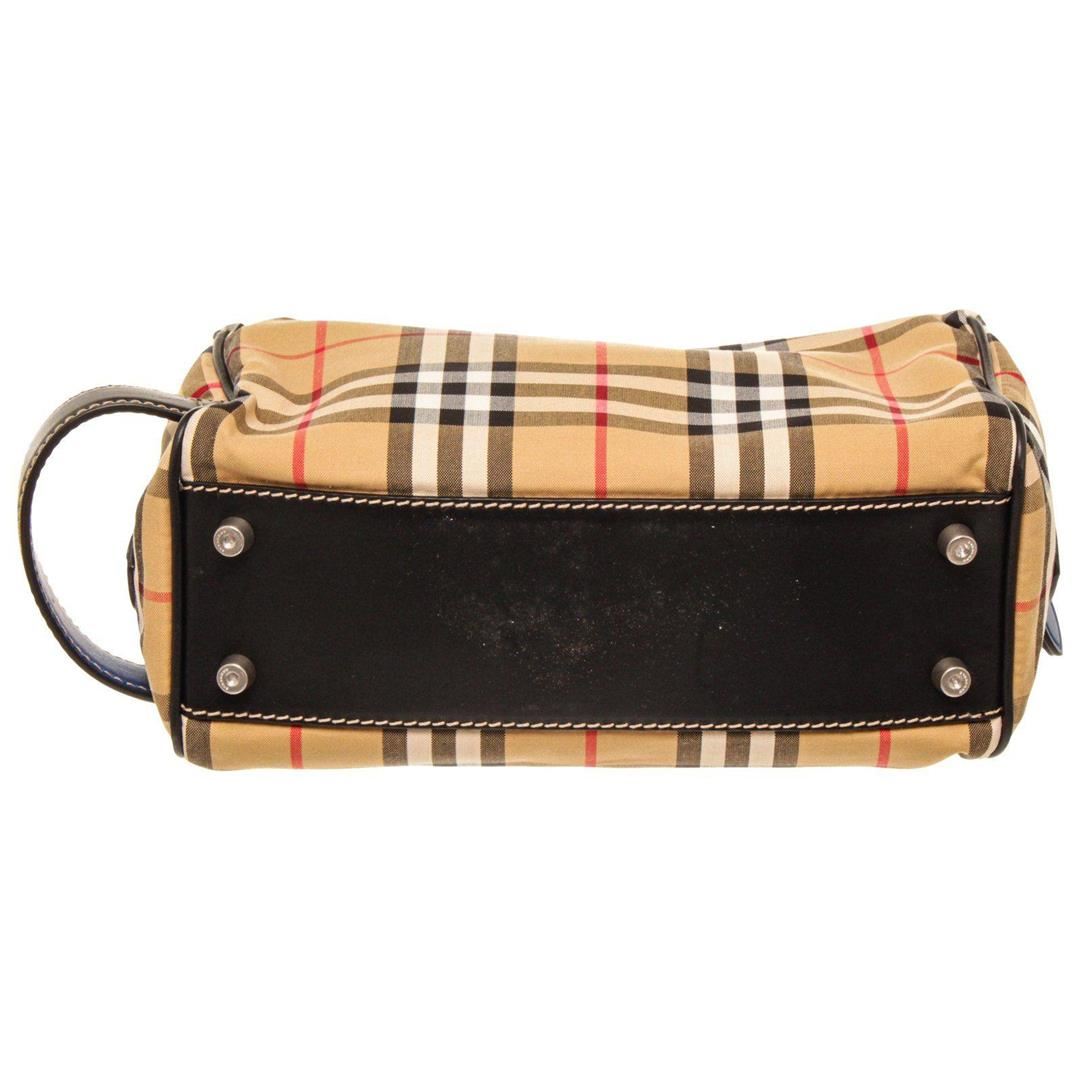 Burberry Tan Patent Leather Cosmetic Pouch with patent leather trim, silver-tone hardware, interior zip pocket, front exterior flap pocket with snap closure, zip top closure, adjustable patent leather shoulder strap.