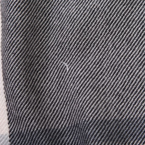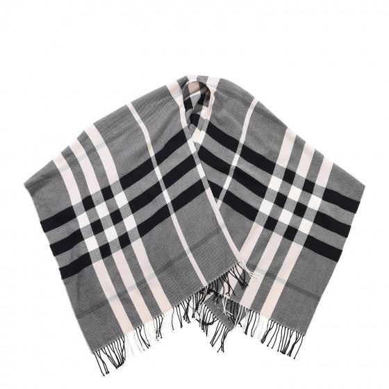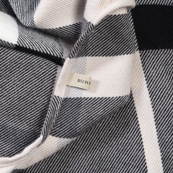 Black Burberry scarf is 100% lightweight merino wool and features a traditional Burberry house check of beige, white, and black.