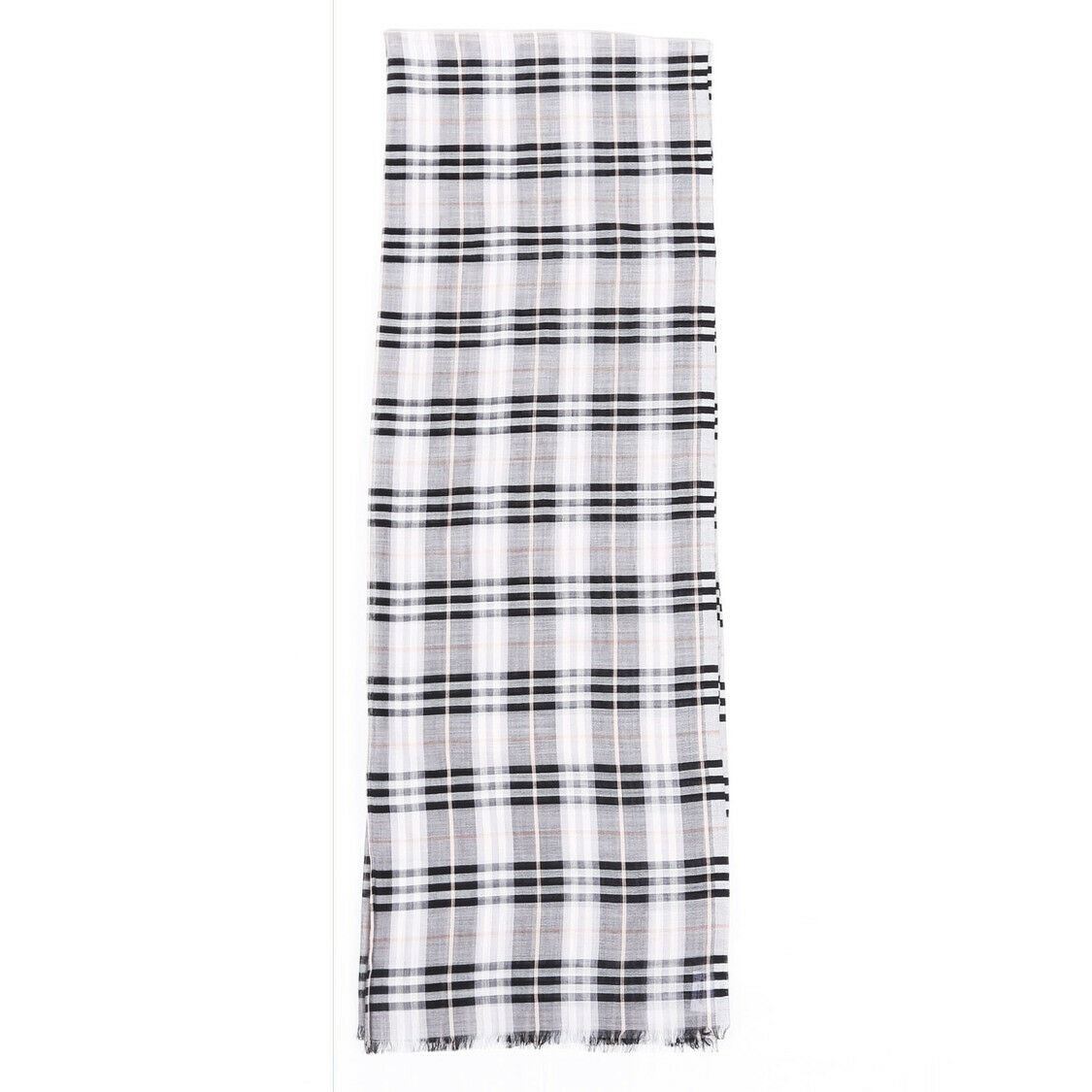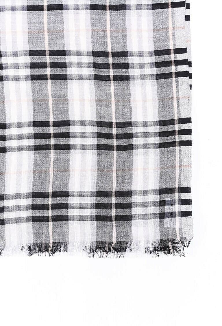Description: Burberry Noca Check wool and silk blend scarf features frayed edges. Comes with: Box, Brand Tags