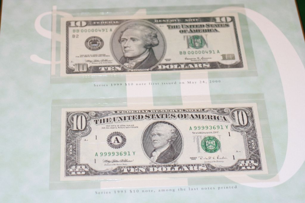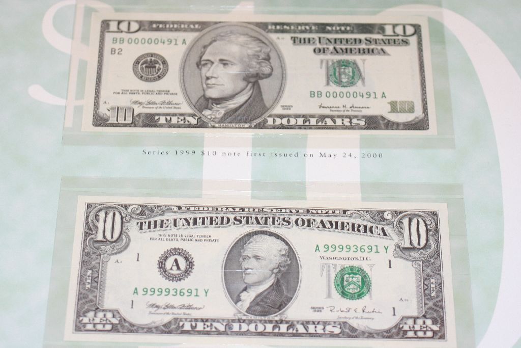 Bureau of Engraving and Printing Premium Historical Portfolio $10; 1995 US Federal Reserve Note $10; Boston MA Reserve & 1999 US Federal Reserve Note $10; Green Seal; Lot of 2