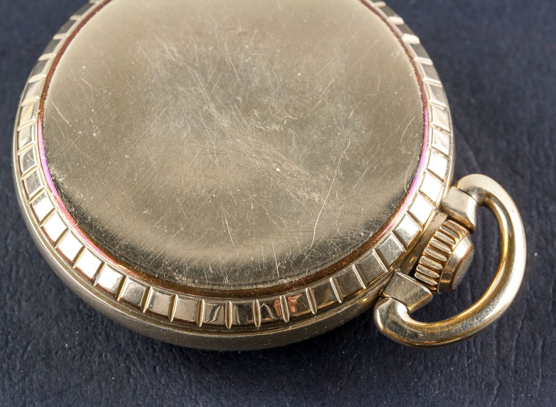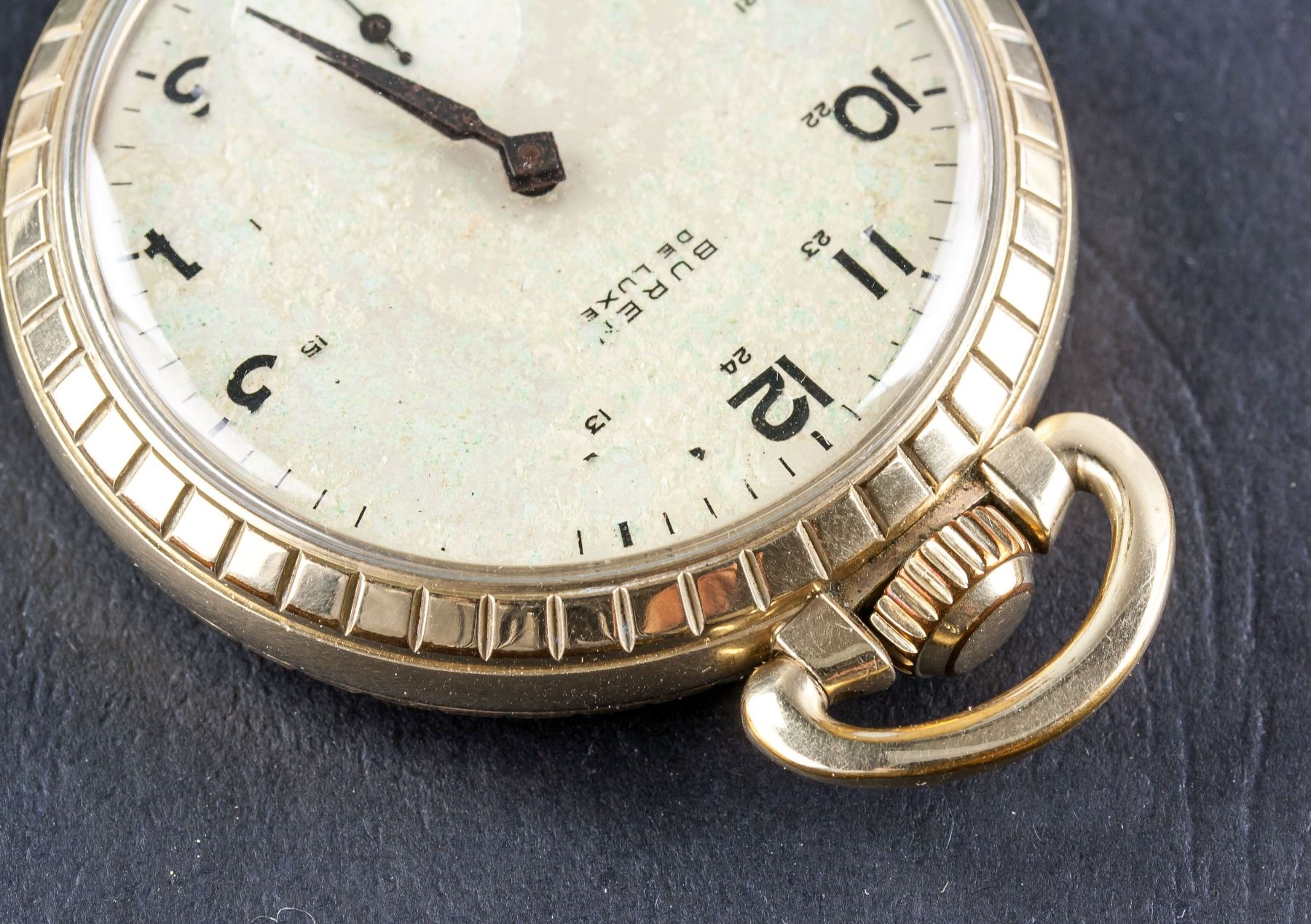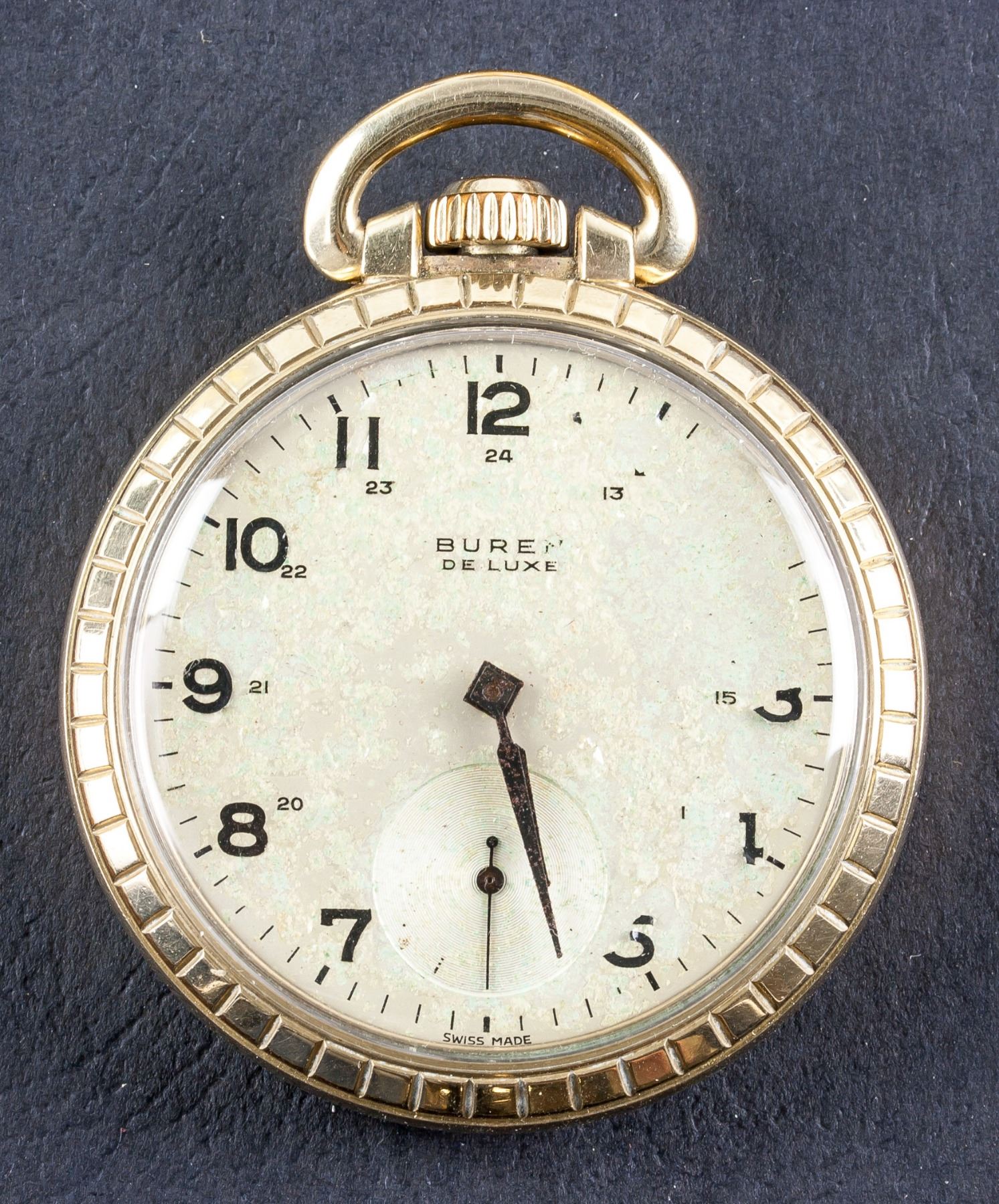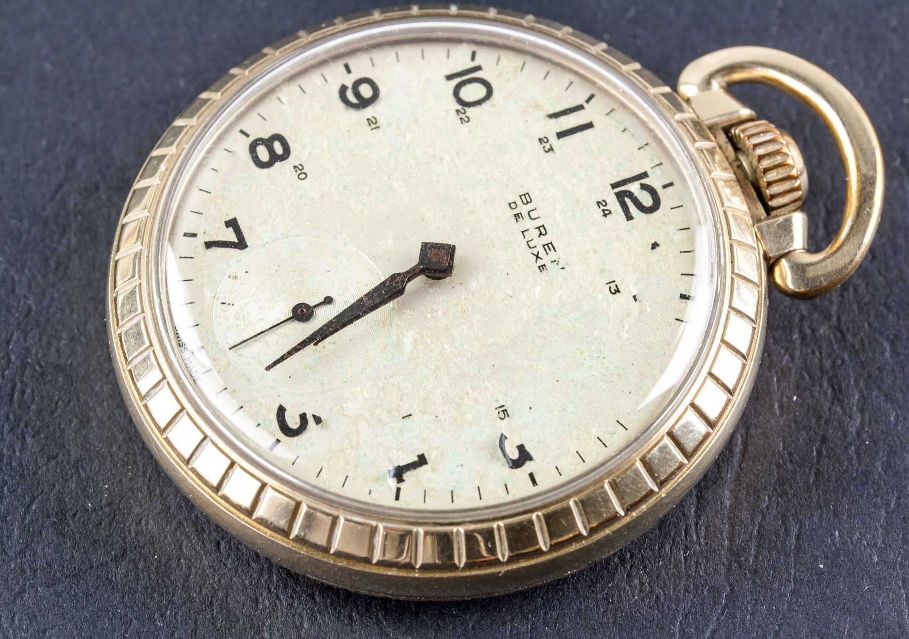 Buren Deluxe pocket watch, Swiss made, minor crack and mold on dial, number fell off on dial, in working condition, D: 50.14 mm, 93 grams