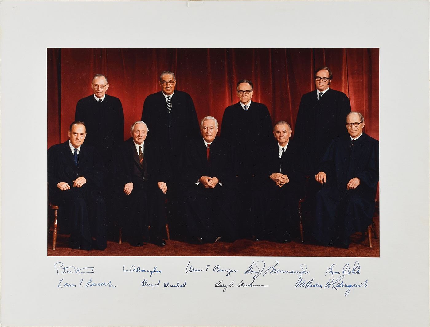 Superb official color satin-finish 14 x 8.75 photo of the justices of the Burger Court, affixed to its original 18 x 13.75 mount, signed on the mount in ink by Potter Stewart, William O. Douglas, Warren E. Burger, William J. Brennan, Jr., Byron R. White, Lewis F. Powell, Jr., Thurgood Marshall, Harry A. Blackmun, and William H. Rehnquist. The reverse bears an ink stamp, "Mr. Justice Blackmun," perhaps indicating that it originally belonged to him or was requested by him. In fine condition, with a bump/short tear to the top edge, easily matted out. This iteration of the Burger Court lasted from 1972 to 1975, and it handed down two especially significant rulings in Roe v. Wade (1973, in a decision written by Blackmun) and United States v. Nixon (1974, in a decision written by Burger). A desirable fully signed portrait of this historically important Supreme Court.