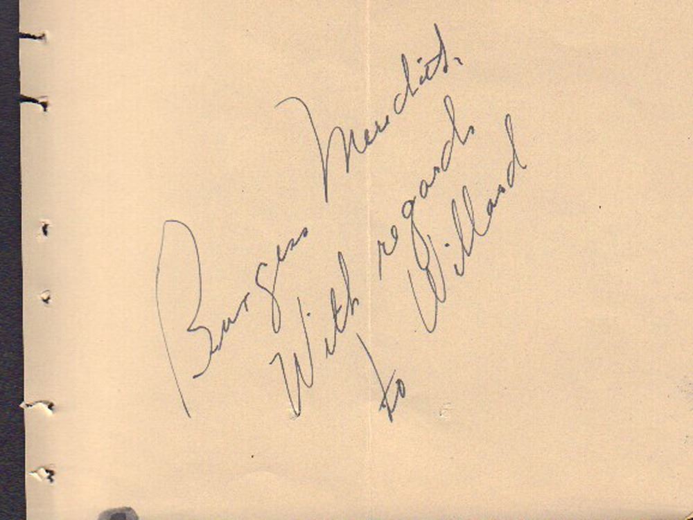 Autograph book page signed by Burgess Meredith. It was inscribed to Willard and the page had been folded in half at some point. All items come with a certificate of authenticity good for the life of the piece.