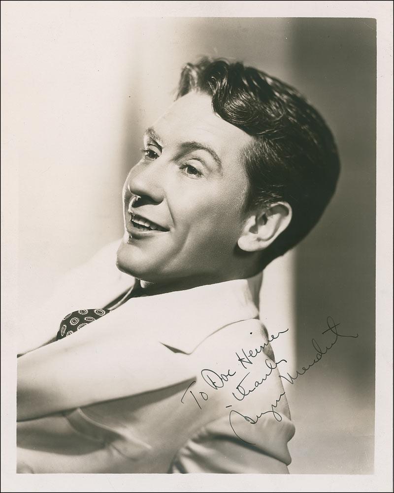 Nice vintage matte-finish 8 x 10 photo, signed and inscribed in fountain pen “To Doc Heimer, thanks, Burgess Meredith.” In fine condition.