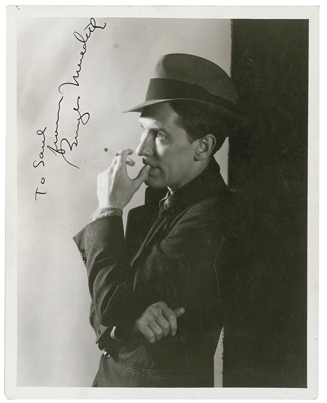 Vintage pearl-finish 8 x 10 double weight photo of Meredith as he appeared in the leading role of The Bridge at the Martin Beck Theatre, signed and inscribed in-person in vertically in fountain pen “To Saul from Burgess Meredith.” Reverse of photo bears collector’s stamp date of June 4, 1936, the date the signature was acquired, as well as a small affixed caption. Several vertical creases to bottom portion of image, a few small stains, and scattered light surface wear, otherwise fine condition. Saul Goodman Collection.
