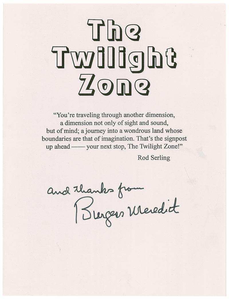 Souvenir TQS of the introductory dialogue from The Twilight Zone on an 8.5 x 11 white sheet, signed at the conclusion in black felt tip, “’And thanks from Burgess Meredit.” In his later years, Meredith often dropped the letter ‘h’ from his last name. In fine condition.