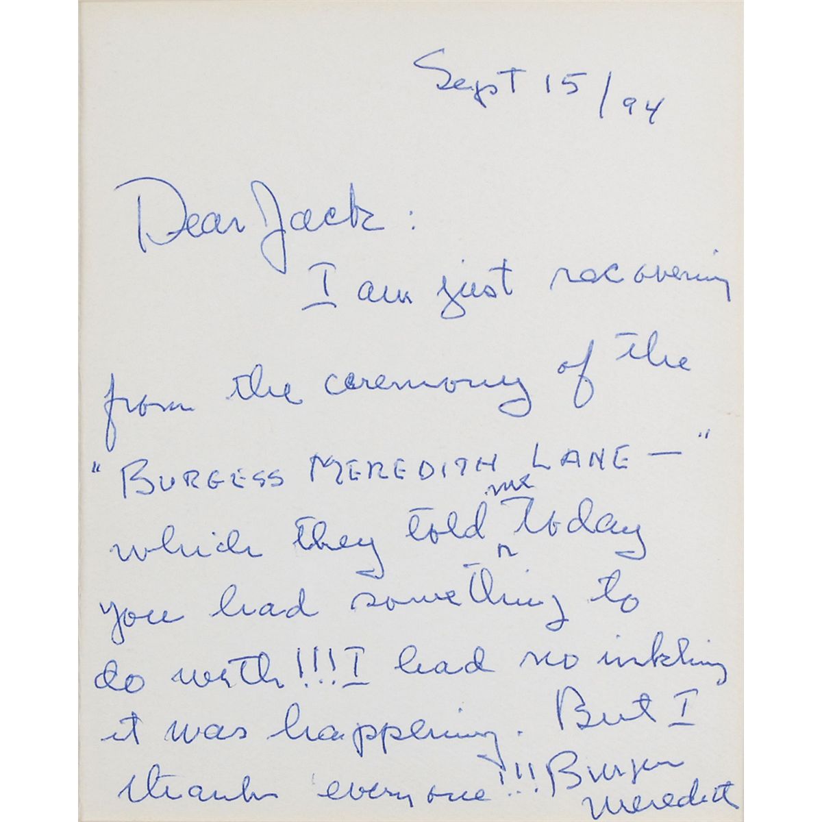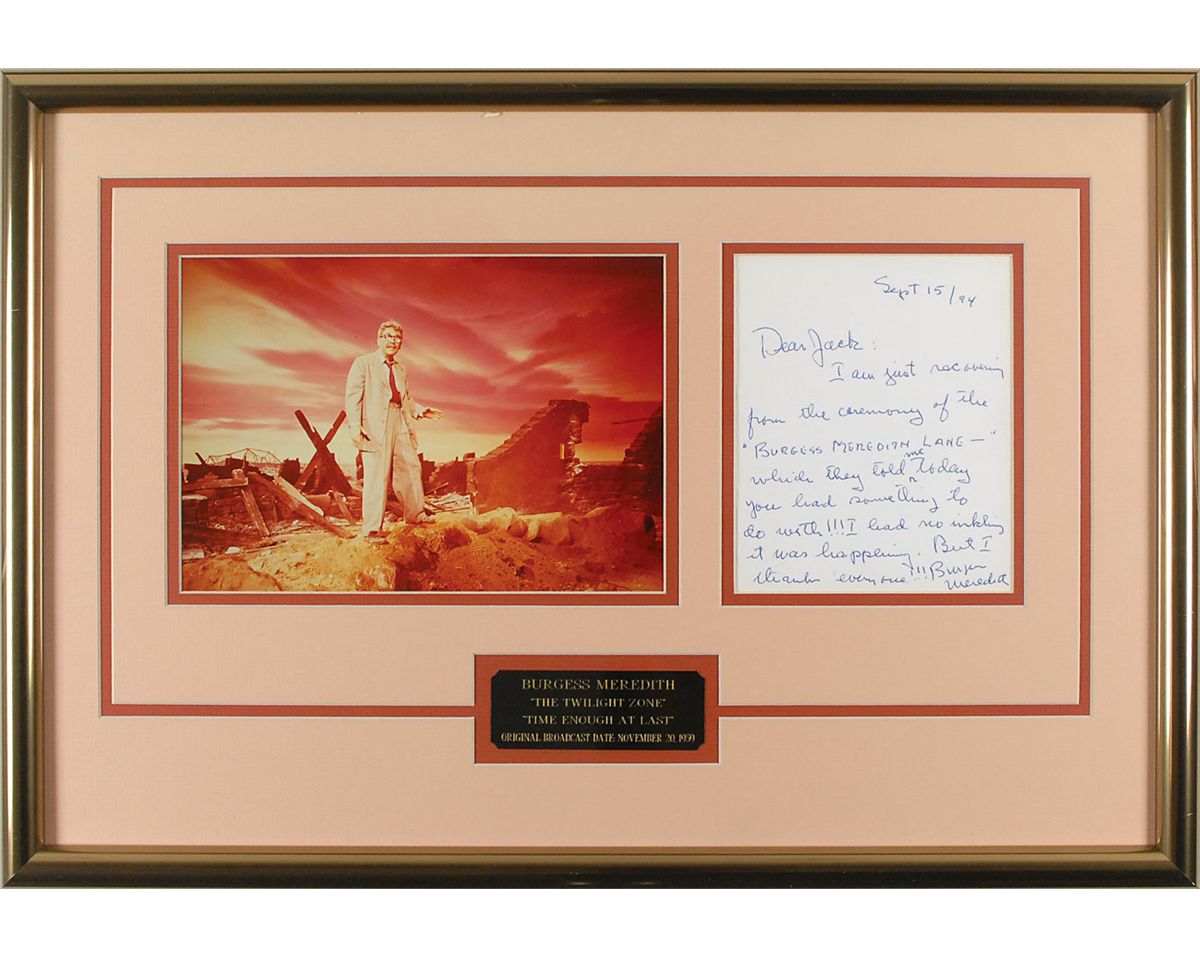 ALS, one page, 5 x 6.25, September 15, 1994. Letter of thanks. In full: “I am just recovering from the ceremony of the ‘Burgess Meredith lane—’ which they told me today you had something to do with !!! I had no inkling it was happening. But I thank everyone!!!” Double-matted with an uncommon colorized portrait of Meredith from his memorable Twilight Zone episode ‘Time Enough at Last’ to an overall size of 22.25 x 15.25. In very fine condition.