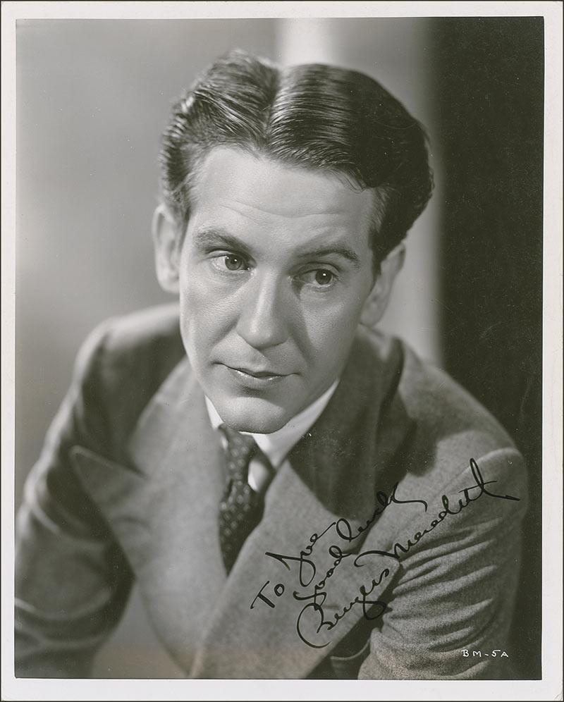 Vintage glossy 8 x 10 photo, credited on the reverse to Ernest Bachrach, signed and inscribed in fountain pen “To Joe, Good luck, Burgess Meredith.” Scattered creases, surface marks, and impressions, otherwise fine condition.