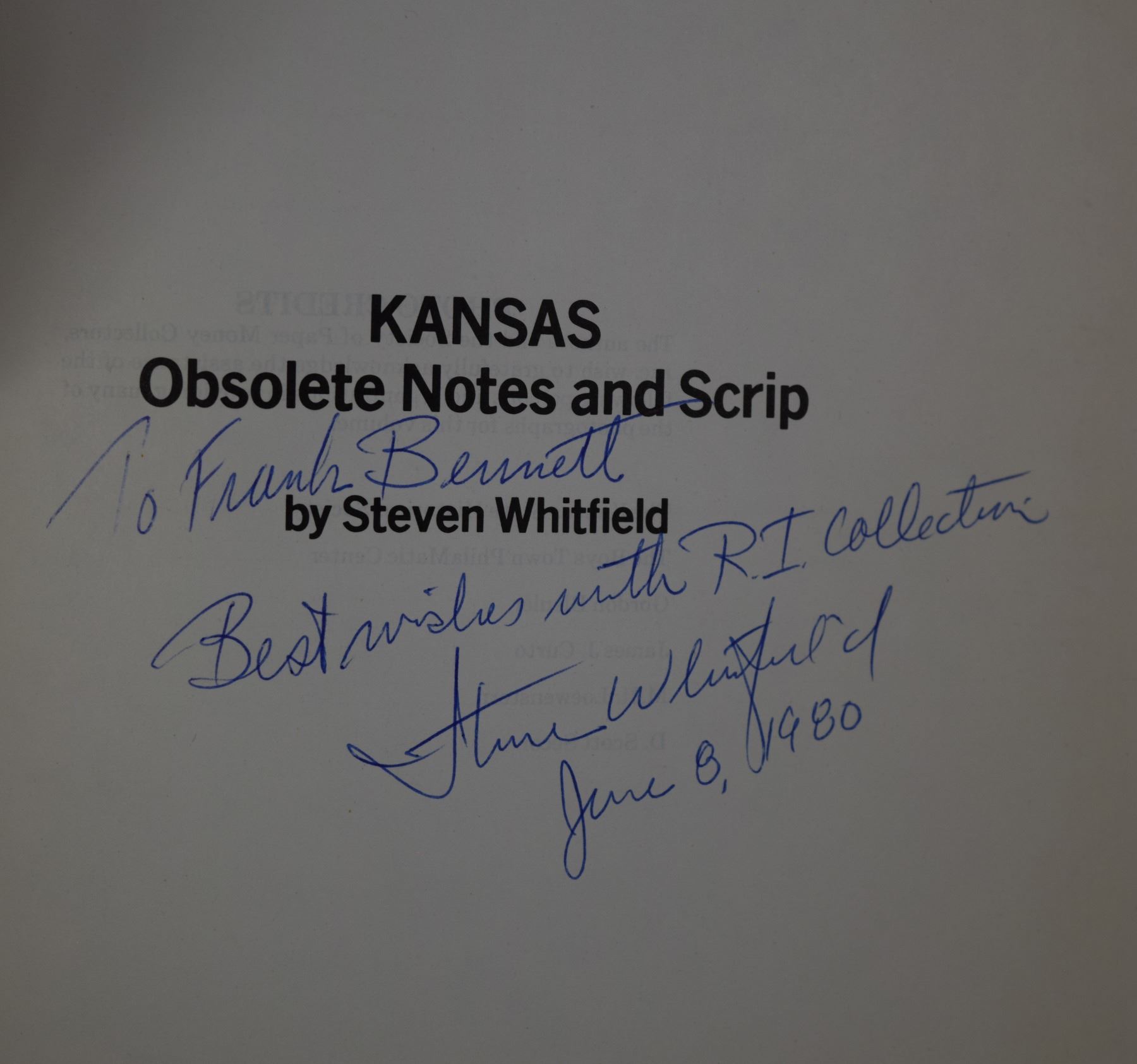 Burgett, Maurice | Whitfield, Steven. (Signed) INDIAN TERRITORY AND OKLAHOMA OBSOLETE NOTES AND SCRIP | KANSAS OBSOLETE NOTES AND SCRIP. Society of Paper Money Collectors. 1980. 4to, 87 pages; Hardcover; Inscribed by the author. Subject: Paper Money - US