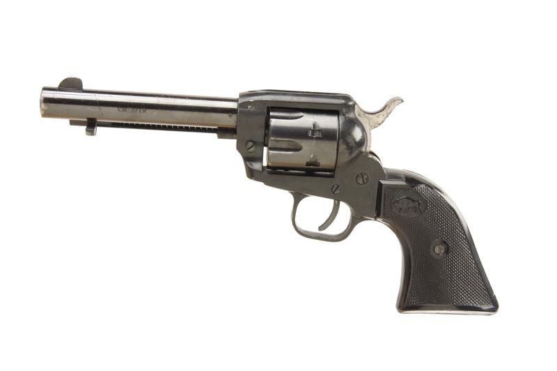 ConditionSingle action 6 shot revolver made in Germany and patterned after the Colt Scout. Blued finish, black checkered grips with buffalo emblem molded in, 4 3/4" barrel with fixed sights, good bore and action.Condition: Very good with a few surface scratches from use, and a light cylinder ring.