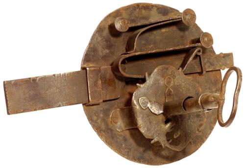 Burgtorschloß, um 1750 Schließmechanismus für bedeutende Gebäude, extragroße und solide Ausführung, Länge des Schlüssels: 30 cm! Schloß Ø 31 cm! Handgeschmiedetes Eisen, funktionstüchtig! – Tolles Stück! Castle Gate Lock Closing mechanism for important buildings, especially large and solid construction, length of the key: 12 in.! Diameter of the lock: 12 1/2 in.! Hand-forged iron, fully functional. – A fantastic piece! – (3+/2-) – € 200/350 – (348/5)