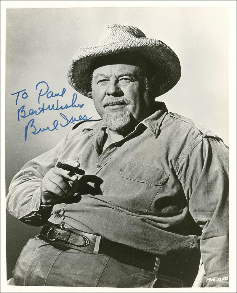 Glossy 8 x 10 Universal publicity photo of Ives as he appeared in The Spiral Road, signed and inscribed in blue felt tip “To Paul, Best wishes, Burl Ives.” In fine condition, with some scattered light creases and promotional information affixed to reverse. Pre-certified PSA/DNA and RRAuction COA.