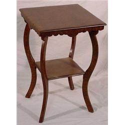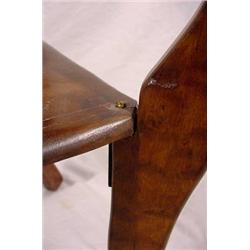 Victorian figural wood lamp stand, Ca. 1880; constructed of a very unusual burled wood (possibly burl maple); exaggerated grain has the look of repeating "cat's eye" knots; refinished repair where shelf meets legs includes replace wood and metal "L" brackets; 29" tall x 19.5" square.