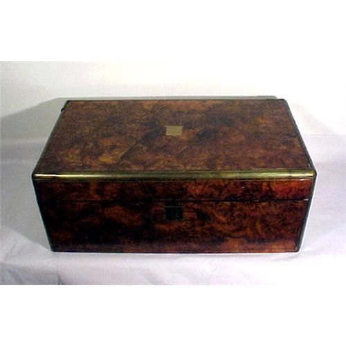 Here is an absolutely outstanding 19th century Burled Walnut lap Travel Desk. This one as I hope you can see has the most outrageous burl walnut ? it is just so highly figured it just screams. The entire box has a brass molding on all corners. Overall the condition is very good ? the surface is just how we found it is a little bit dirty and could use a good cleaning. It has a brass plaque on the top with no monogram and a brass escutcheon on the front of the box. On the back left bottom of the box there is a section of brass molding that is missing. All around the front there is also a fine string inlay of brass and a piece or two is a bit lifted ? but I would have to say that overall the condition is really excellent. This box dates from the middle 1800?s and it has the two fold out compartments inside that are lined with what appears to be the original black leather it also has the compartments in the front for the inkwell and pens and so forth. Great box - one of the many uses for today would be to have a stand made for this and you can use it as a little table between two chairs etc ? they really work well for that purpose. It measures 17 7/8?w x 7 1/8?h x 10 1/8? deep.