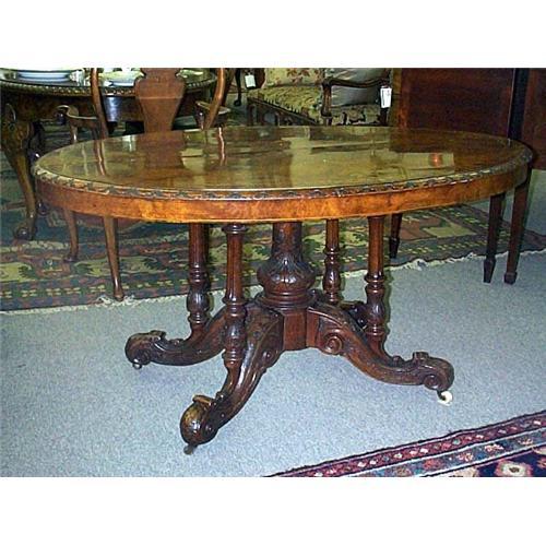 English Burl Walnut Oval Library Table with Marquetry Inlay and Carved Base
