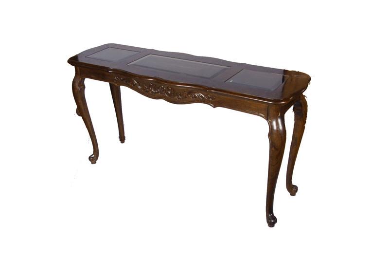 Burl Walnut Sofa Table Glass insets, cabriolet, contemporary, measures 52"Lx15"Wx27"H.Glass insets, cabriolet, contemporary, measures 52"Lx15"Wx27"H.