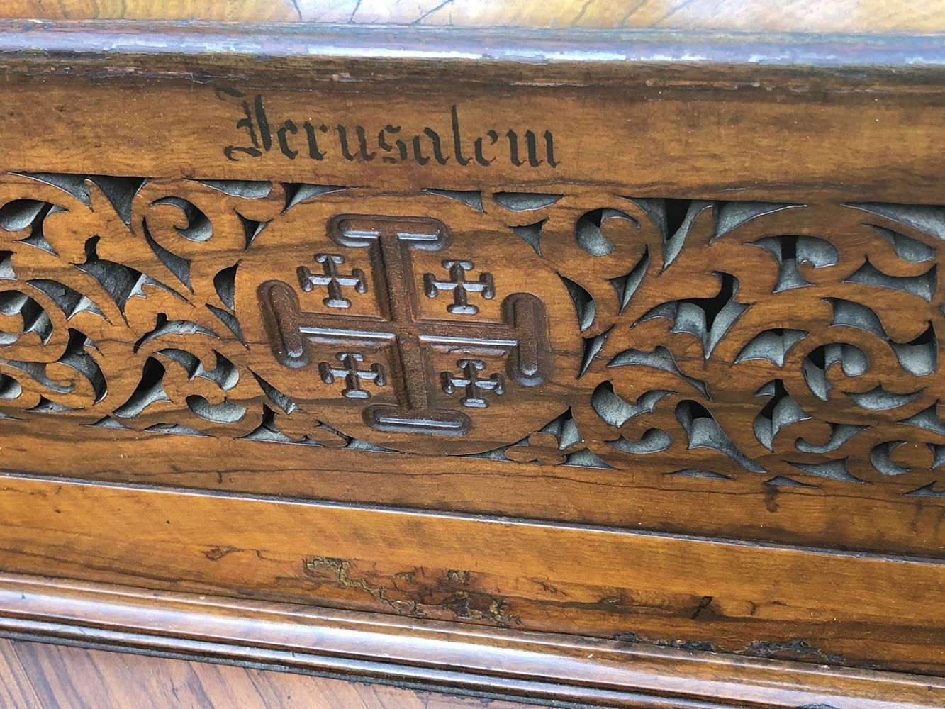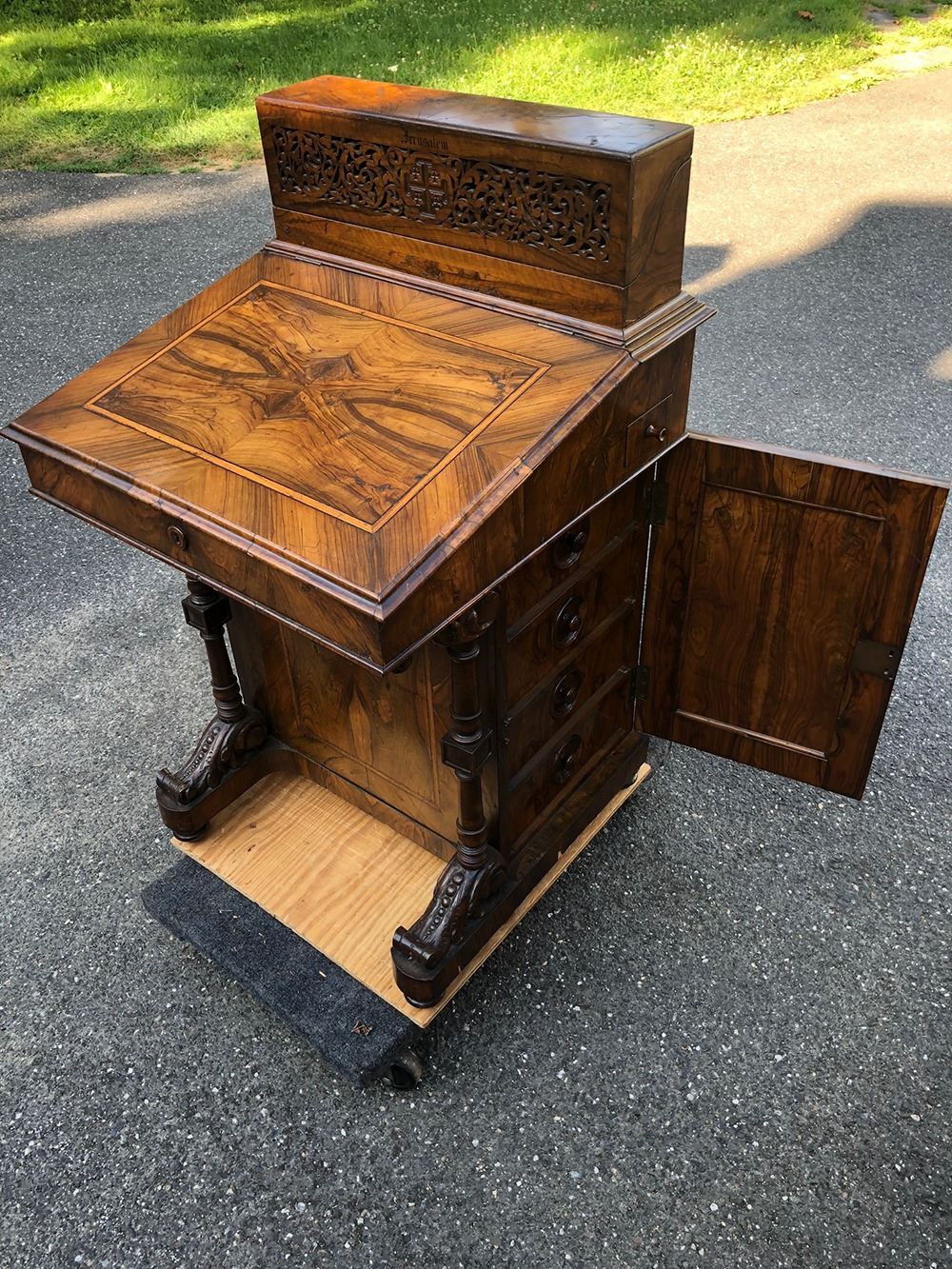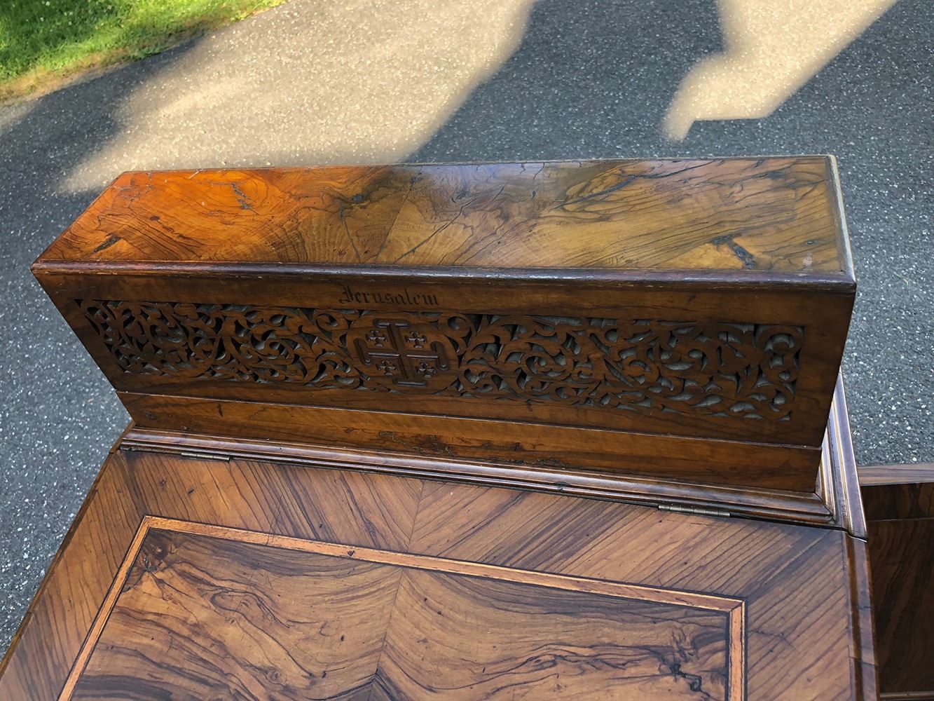 Outstanding captain's desk, all burl wood, absolutely stunning, has the hidden drawers on the side, opens up with hidden compartment (for ink quill pens, etc.).In outstanding original finish, high grade carvings, has Jerusalem''carved on top. Opens up for letters, cards, etc. All open fretwork carving. Truly a fabulous, one of a kind piece!