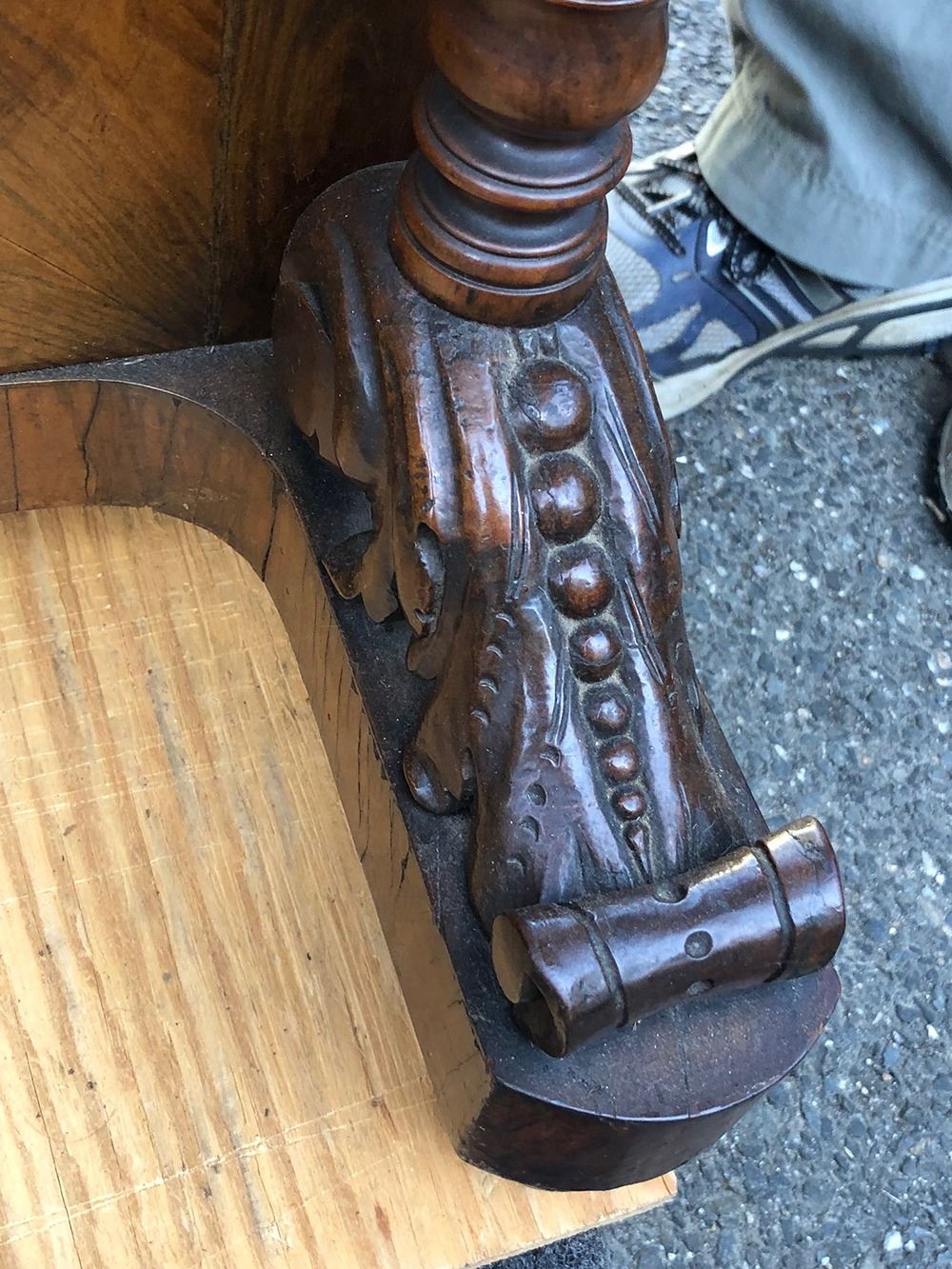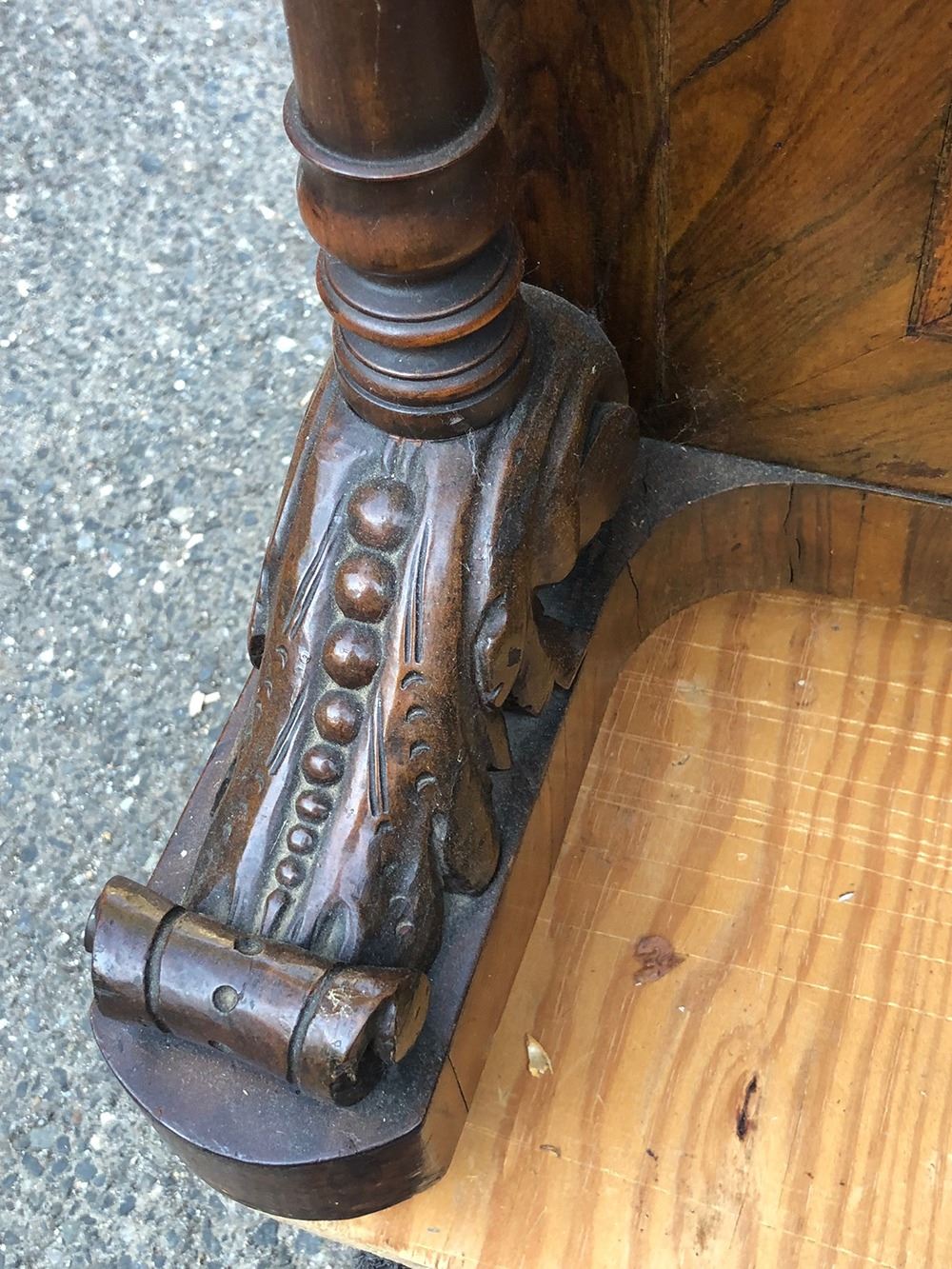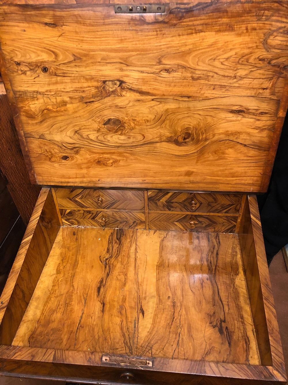 Outstanding captain's desk, all burl wood, absolutely stunning, has the hidden drawers on the side, opens up with hidden compartment (for ink quill pens, etc.).In outstanding original finish, high grade carvings, has Jerusalem''carved on top. Opens up for letters, cards, etc. All open fretwork carving. Truly a fabulous, one of a kind piece!