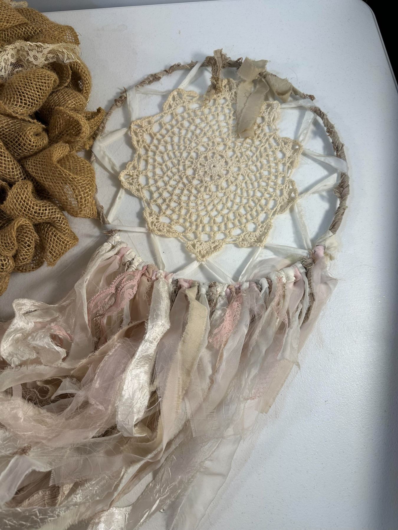 Charming rustic lot featuring a burlap and lace wreath with beaded butterfly accents, paired with a crochet dreamcatcher adorned with soft fabric ribbons. Shabby chic / farmhouse-style décor. Likely late 20th to early 21st century. Light wear from display, overall good condition.