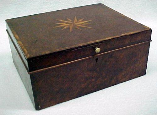 Burled walnut veneer box with double star satinwood inlay on top of hinged lid; interior has miscellaneous wood pieces that might have once been part of fitted interior; measures 5" high x 8" x 10 1/2"; 19th C. good patina and condition (minor loss to ven