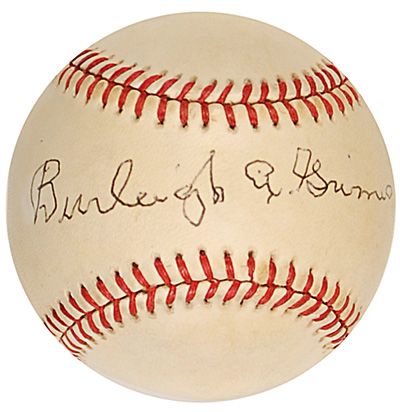Official Rawlings National League baseball signed in black ballpoint on the sweet spot, “Burleigh A. Grimes.” In very good condition, with moderate toning to ball.