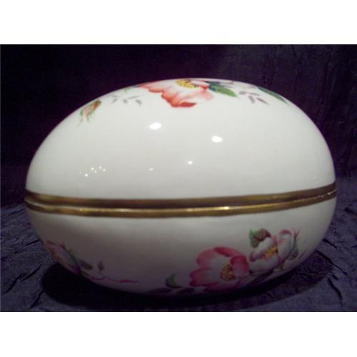 Beautiful Burleigh Ware by Burgess and Leigh, England hand painted egg trinket box. This has pretty wild pink and white roses on vine with gold gild trim. The box measures 4 1/2" by 3 1/4" and is 1 1/2" deep. It's marked on the bottom: BURLEIGH WARE, BURGESS & LEIGH, BURSLEM, ENGLAND, IRONSTONE. The 1950's - 60's box is in excellent condition showing no wear, chips or cracks.