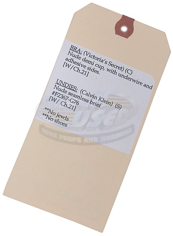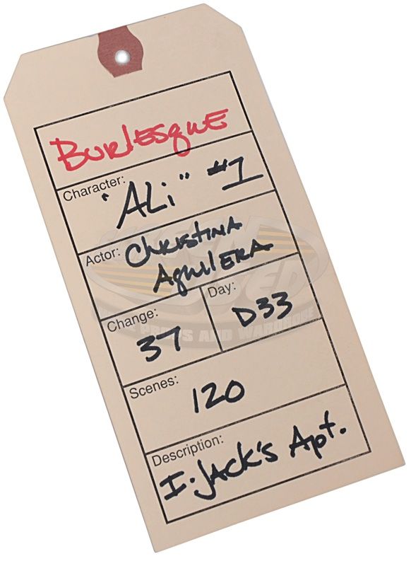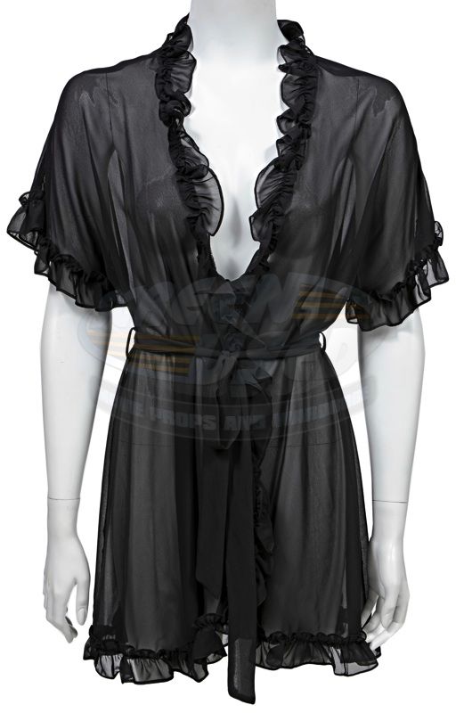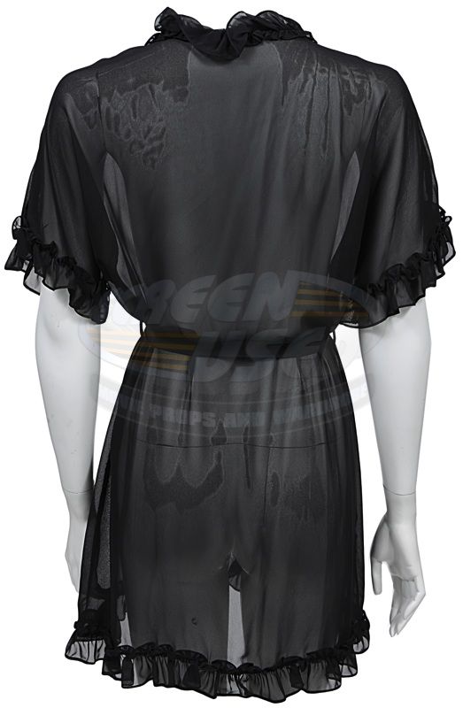 (Screen Gems, 2010) This robe was acquired for the production for use by Christina Aguilera as Ali. The robe is a black see-through with no size marked and the manufacturers tag has been removed. Included with the robe is a production used costume tag that details the scene numbers, change number and costume details.