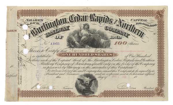 1901, Iowa. Stock certificate for 100 shares. Green/Black. Engraved vignette of seated female allegorical figure at top center, spread eagle below. Punch cancelled and Fine.