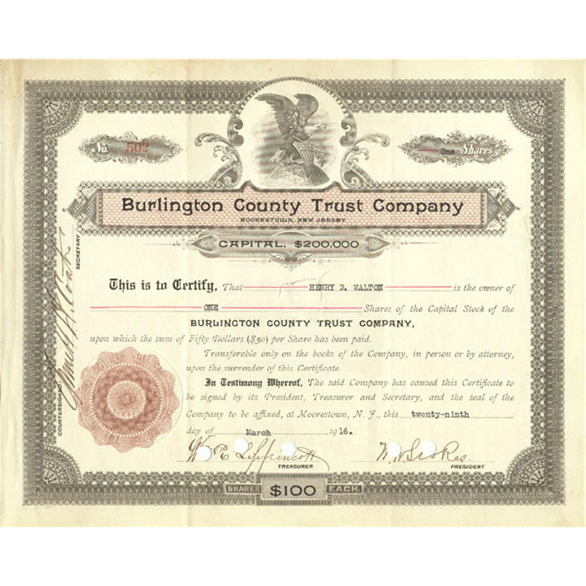 1916. New Jersey. Stock certificate for one share. Black. Vignette of eagle at top center. Very fine.