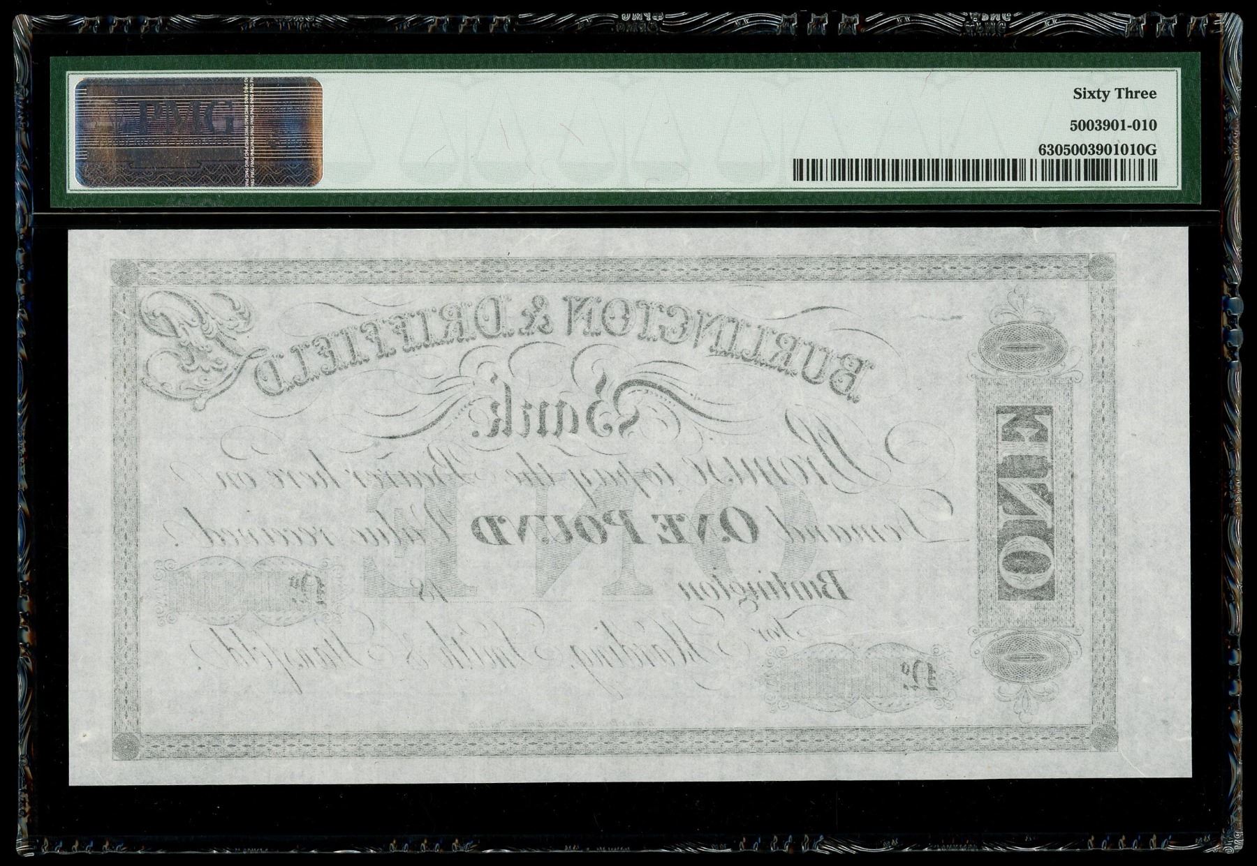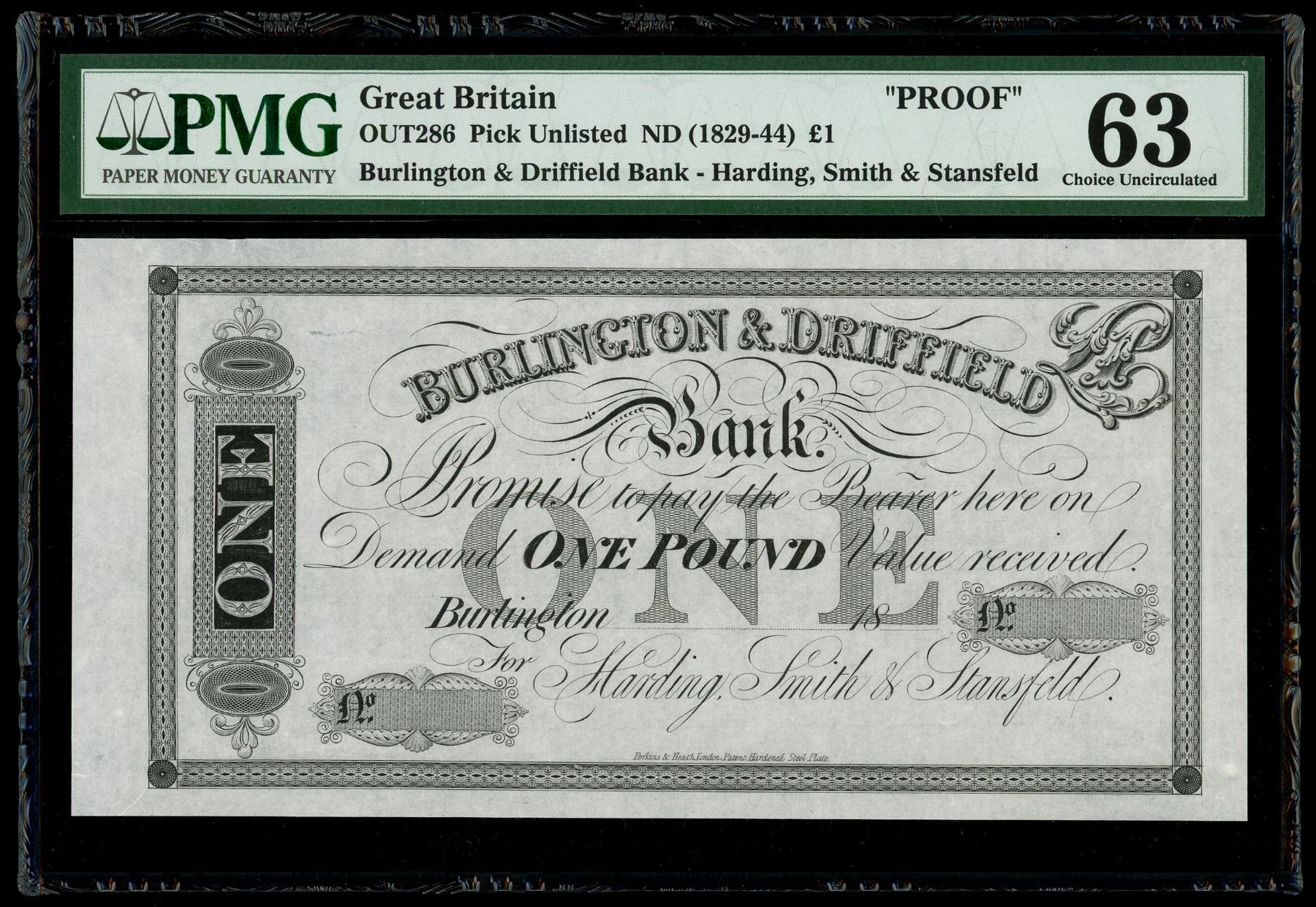 Burlington, Great Britain, Burlington & Driffield Bank, 1 pound front proof, no date (1829-44), PMG Choice UNC 63. SCWPM-unlisted; OUT-286. Choice and fully original uniface proof with good centering. Please use this link to verify the certification number