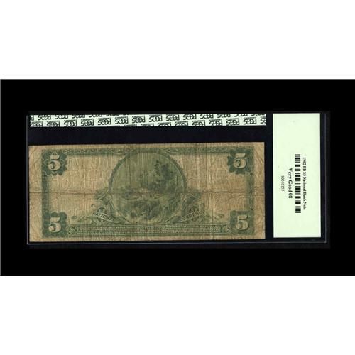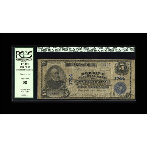 <B>Burlington, IA</B></I> - $5 1902 Plain Back Fr. 601 <B>The Merchants NB</B></I> Ch. # 1744<BR>We sold a Choice CU example in this denomination from here just a few months ago in Long Beach for $632.50. This <B>PCGS Very Good 08</B></I> is at the other end of the appearance spectrum and should sell for roughly...