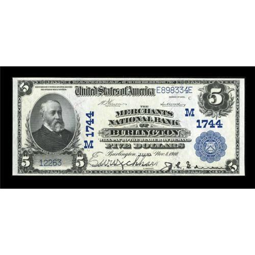 <B>Burlington, IA</B></I> - $5 1902 Plain Back Fr. 601 <B>The Merchants NB</B></I> Ch. # (M)1744<BR> A nicely centered and very bright example with loads of eye appeal. This example is new to the census, but abuts a small run of CU specimens. <B>Choice Crisp Uncirculated.</B></I><BR><I>From The Thomas M. Flynn Collection</B></I><BR><BR><b>Shipping:</b> Coins & Currency (<a target="_blank" href="http://www.heritageauctions.com/common/shipping.php">view shipping information</a>)