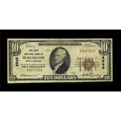 <B>Burlington, NC</B></I> - $10 1929 Ty. 1 <B>The First NB</B></I> Ch. # 8649<BR> Just the second small size example to appear for this issuer. It is also the only Type One $10 known. <B>Fine</B></I> with a bit of toning overall and strong margins for the grade. Expect a realization for this tough North Carolina National in the area of...<BR><BR><b>Shipping:</b> Coins & Currency (<a target="_blank" href="http://www.heritageauctions.com/common/shipping.php">view shipping information</a>)