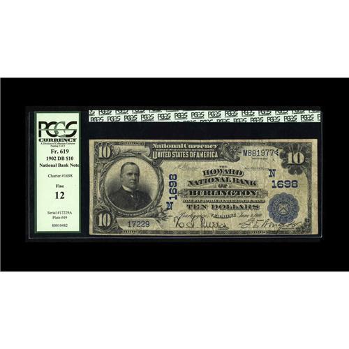 <B>Burlington, VT</B></I> - $10 1902 Date Back Fr. 619 <B>The Howard NB </B></I> Ch. #(N)1698<BR>A Burlington Date Back that would make a nice match for the $10 Plain Back from this institution offered below. <B>PCGS Fine 12.</B></I>