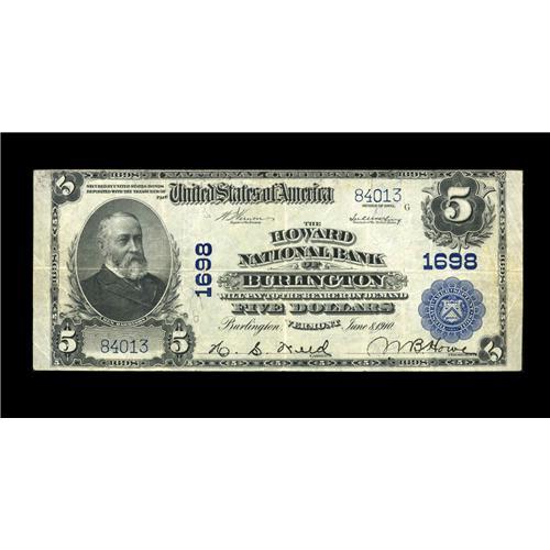<B>Burlington, VT</B></I> - $5 1902 Plain Back Fr. 601 <B>The Howard NB</B></I> Ch. # 1698<BR>A considerably nicer than average note from this Vermont bank. <B>Very Fine.</B></I>