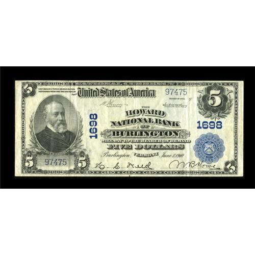 <B>Burlington, VT</B></I> - $5 1902 Plain Back Fr. 601 <B>The Howard NB</B></I> Ch. # 1698<BR> This note is the poster child for the <B>Very Fine </B></I>grade with bright paper, boldly printed devices, and some remaining embossing. <BR><BR><b>Shipping:</b> Coins & Currency (<a target="_blank" href="http://www.heritageauctions.com/common/shipping.php">view shipping information</a>)