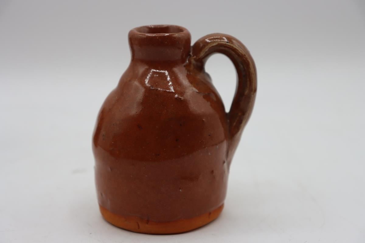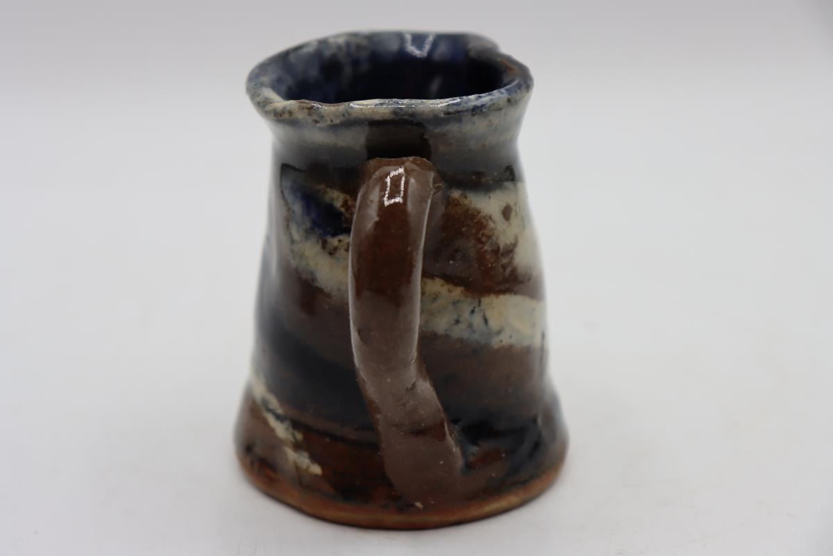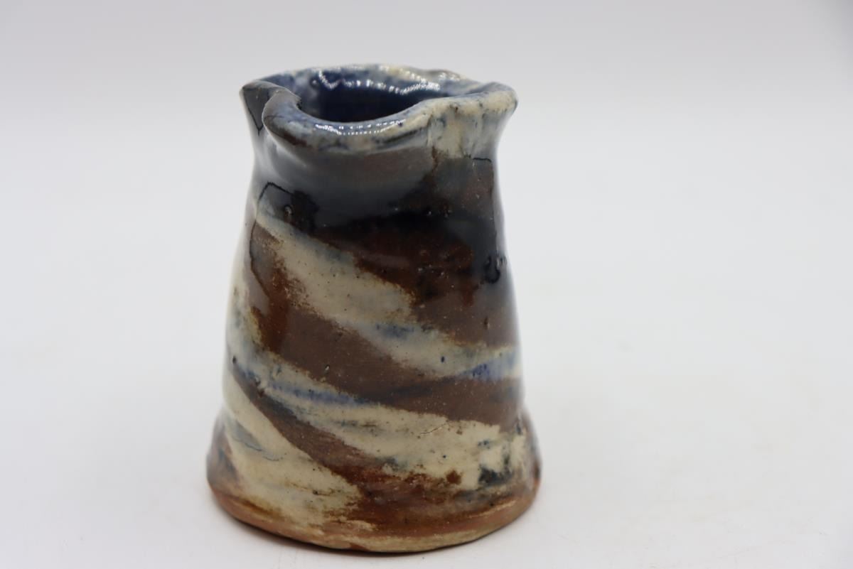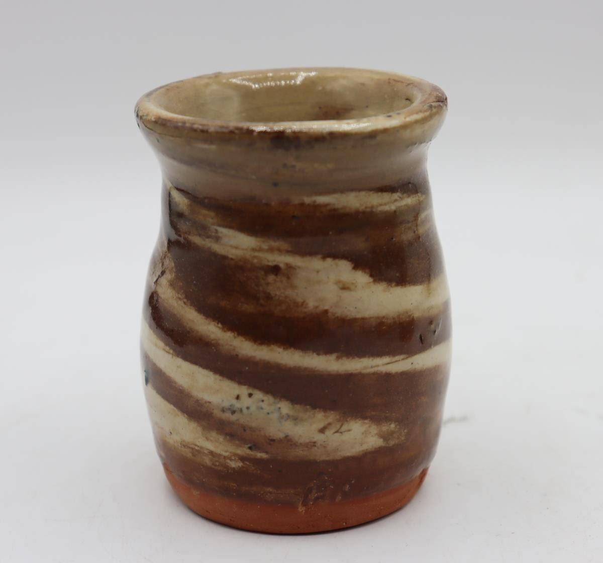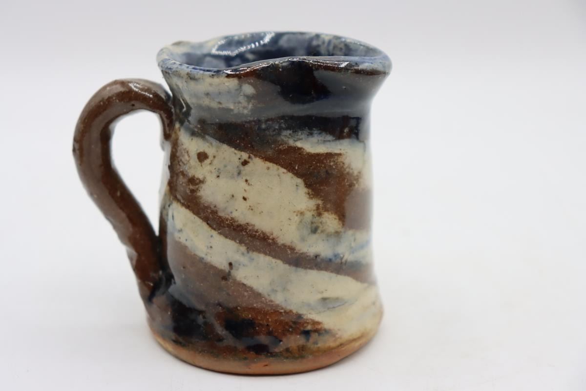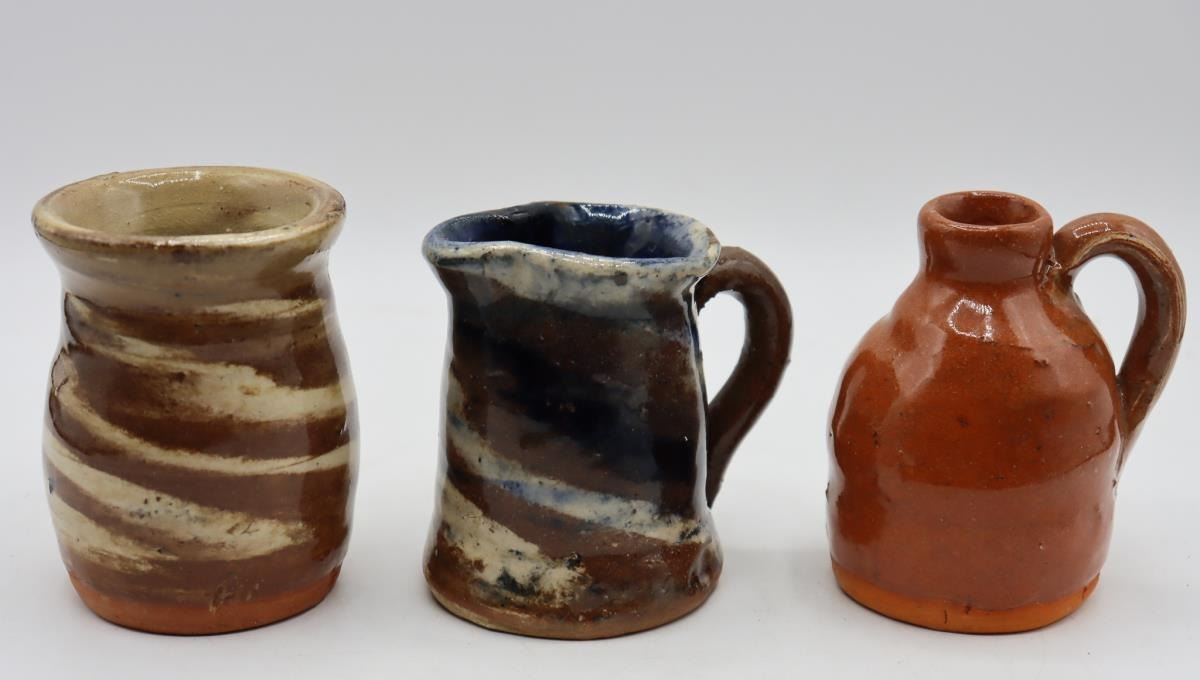 RARE Three miniatures- a Vase, a Jug and a Pitcher. (All in one photo). From the master of the craft. Miniatures with beautiful swirls. Brown and white swirl mini Vase. Tri-Swirl Pitcher with brown, blue and white swirls. Terra-cotta red Jug. All stamped “BB” on the bottom.