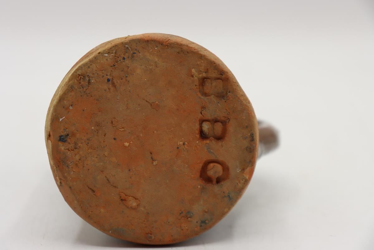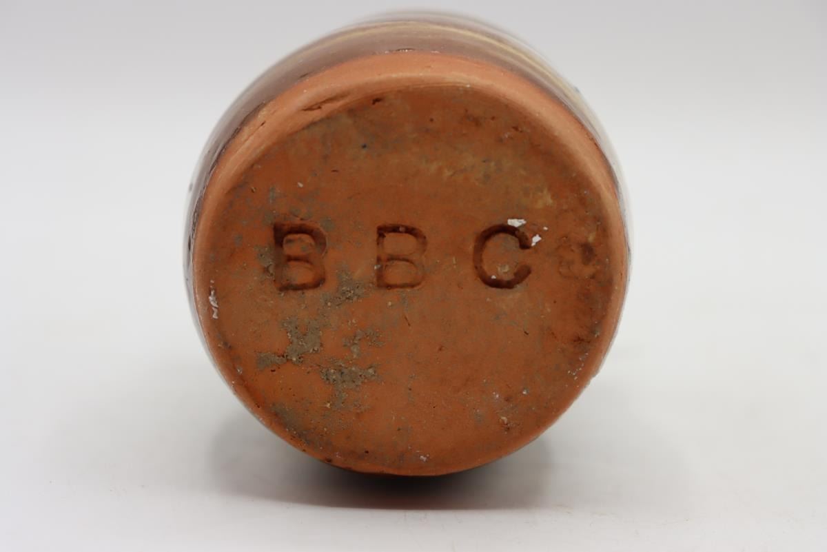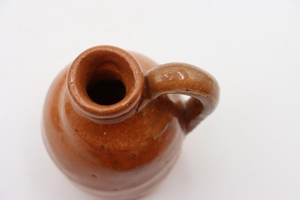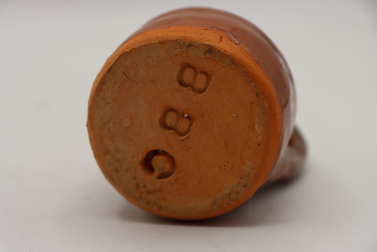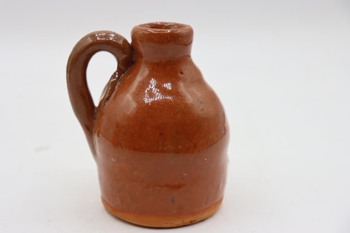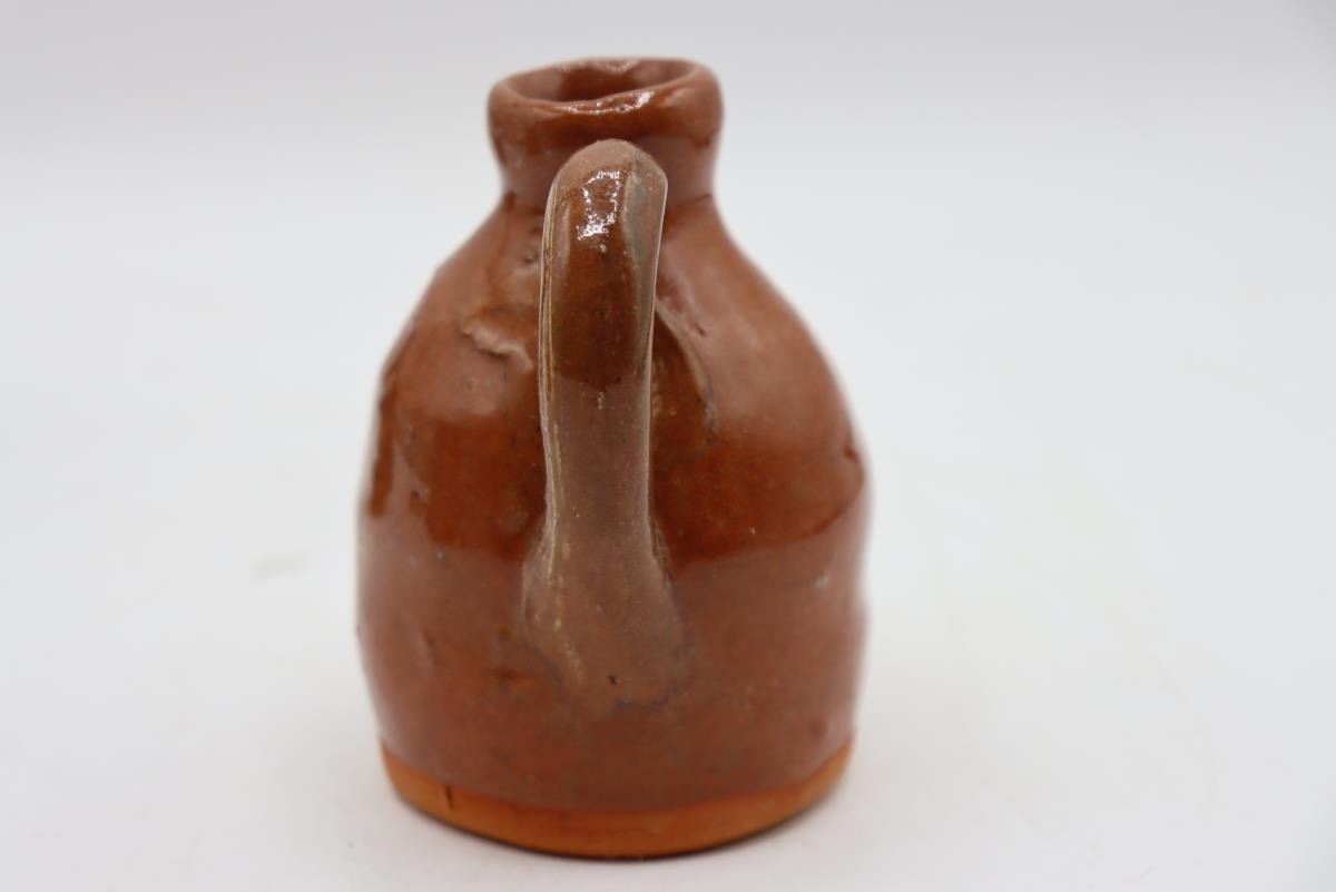 RARE Three miniatures- a Vase, a Jug and a Pitcher. (All in one photo). From the master of the craft. Miniatures with beautiful swirls. Brown and white swirl mini Vase. Tri-Swirl Pitcher with brown, blue and white swirls. Terra-cotta red Jug. All stamped “BB” on the bottom.