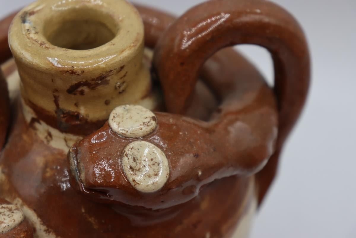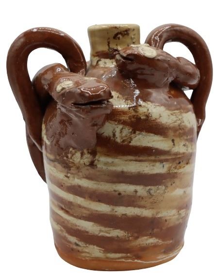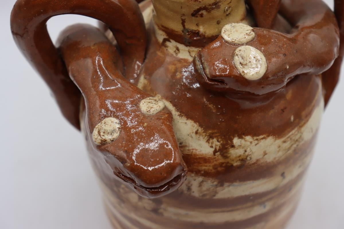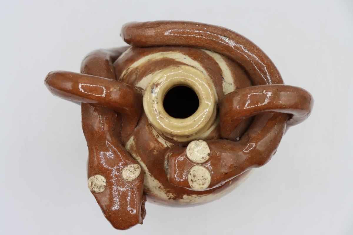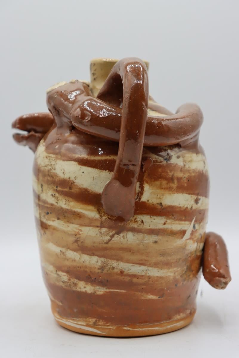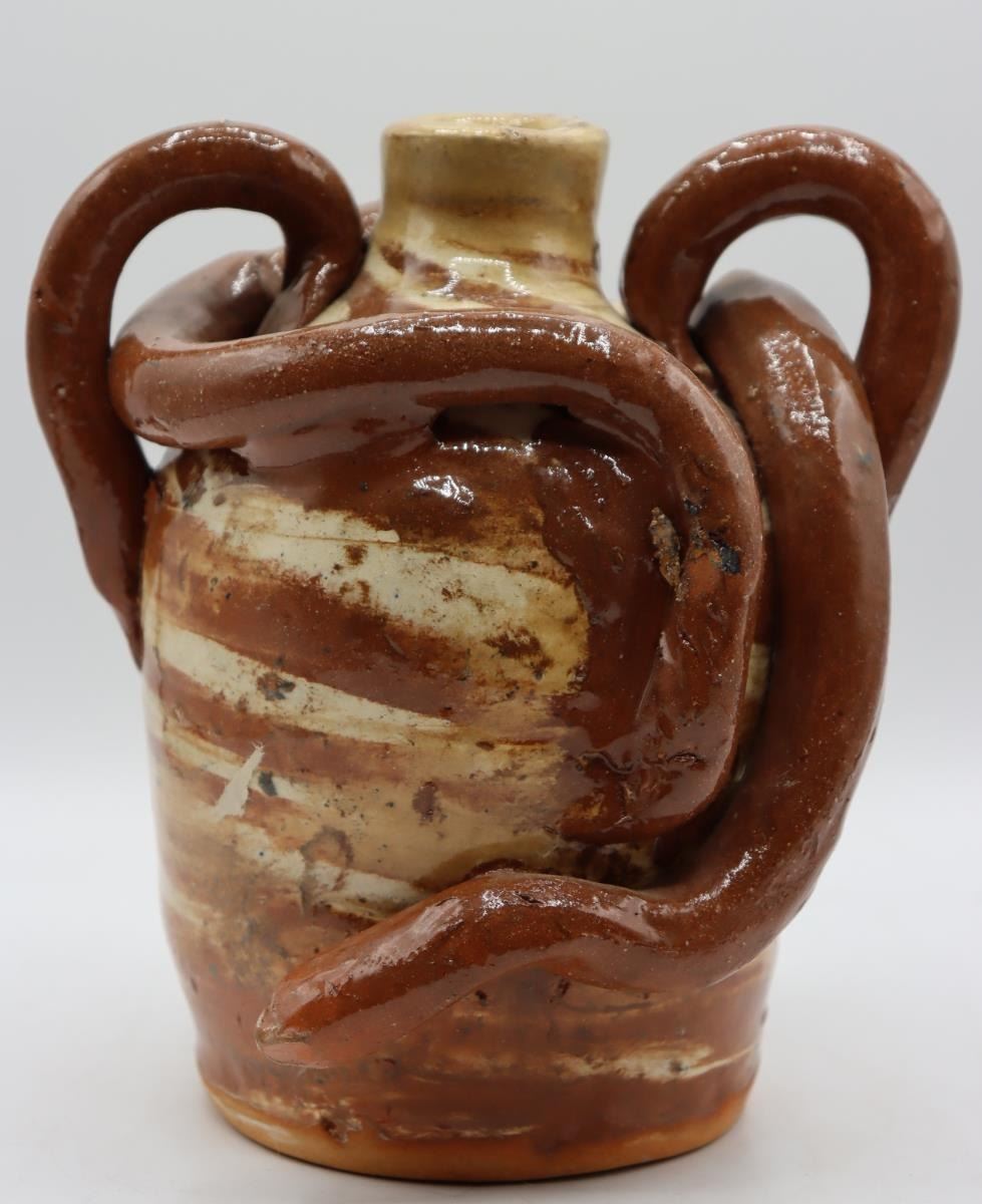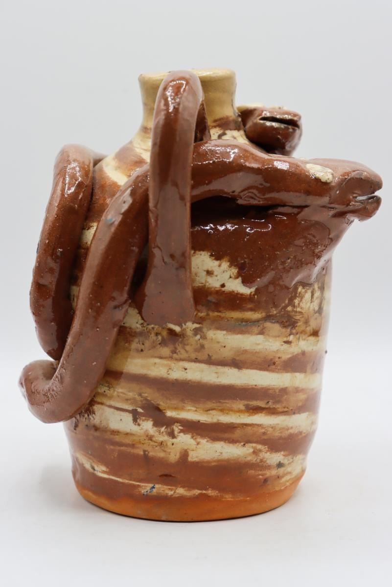RARE Double swirl Snake Jug, Vale NC, 7.5” tall x 7" wide, 1998, Terracotta red and white swirl jug with two handles and two snakes guarding the top! By this Master of the craft.