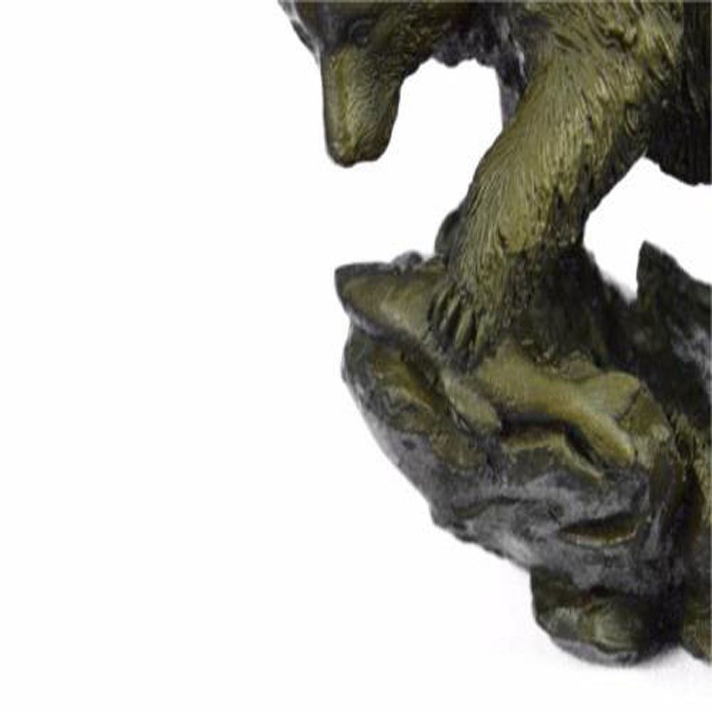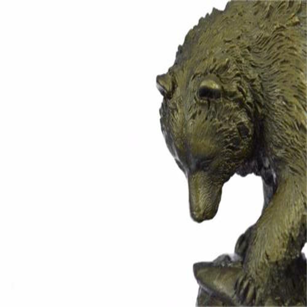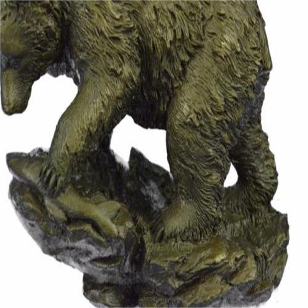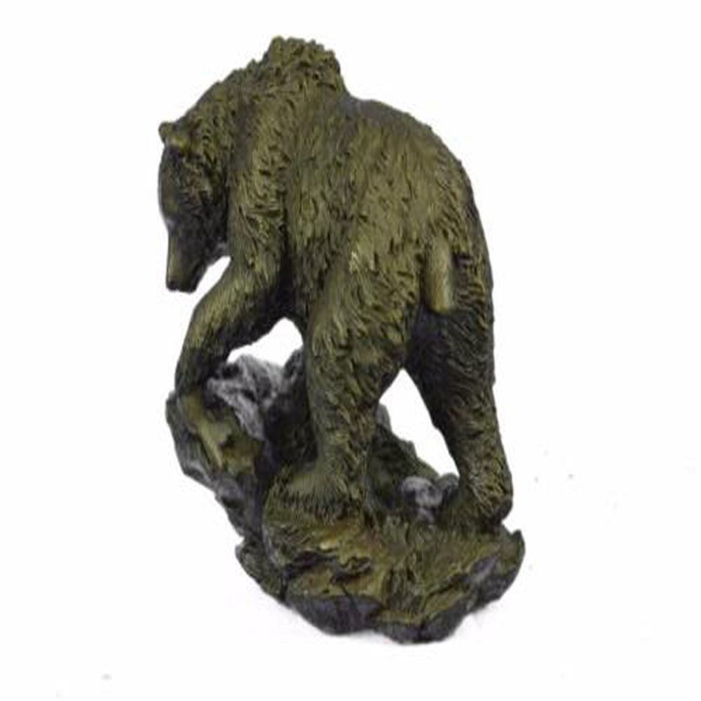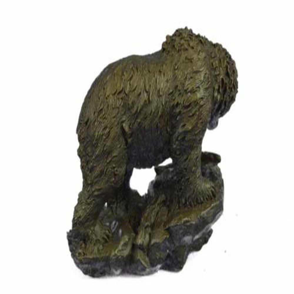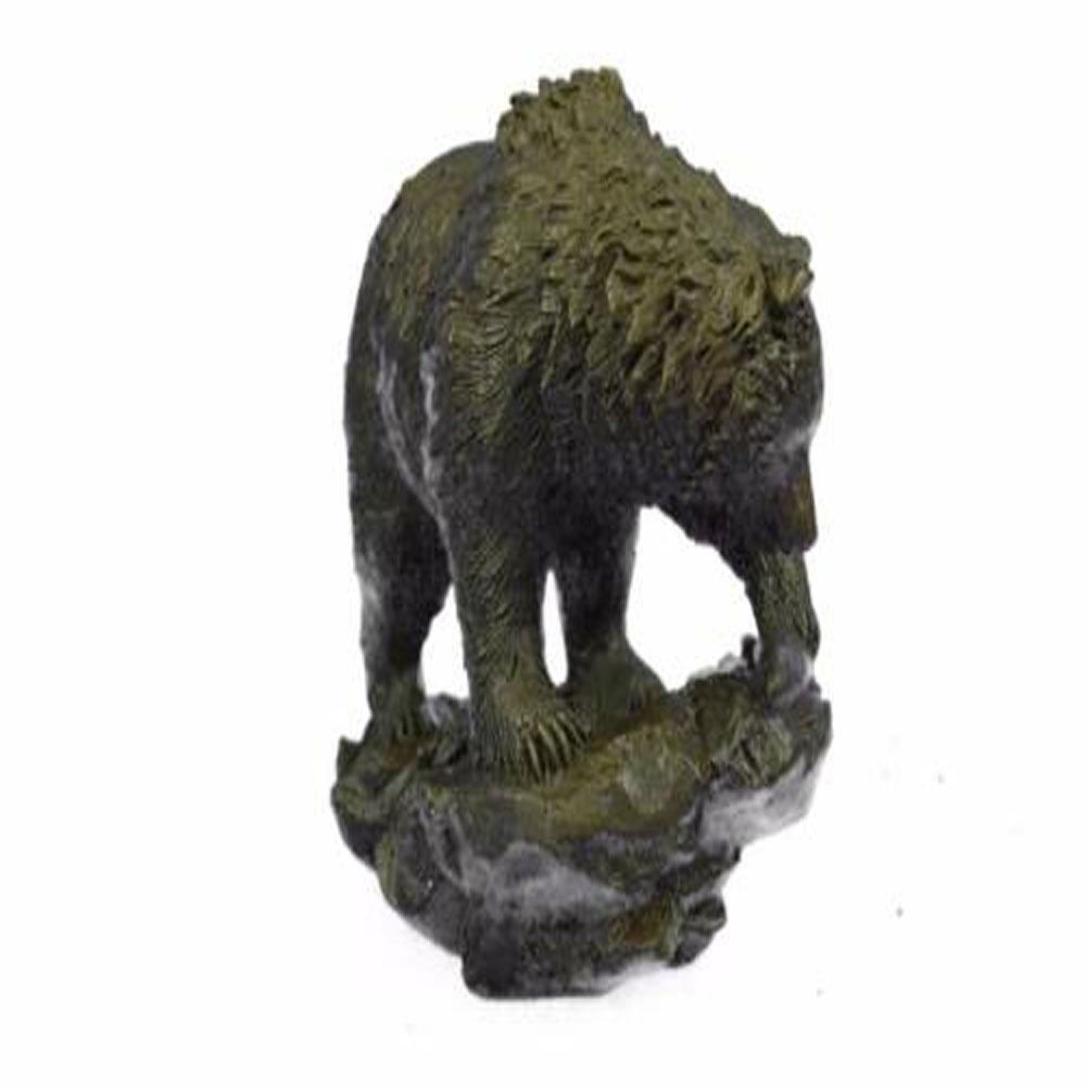 This big burly bear sinks his claws into a salmon that he caught from strong currents of the stream. He stares deep into his next meal, his mouth watering. The fur is thick and puffy as protection during the hibernation. This meal is his first after the long hibernating slumber. This Sculpture was crafted using the lost wax method. Bronze Dimensions: Height 6 X Width 6 Inches. Weight: 5 LBS.