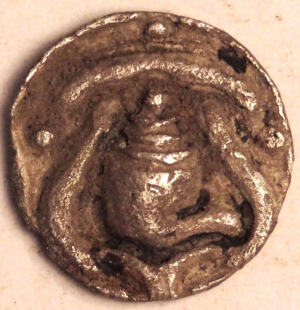 Silver, weight 2.5 grams - Burma 600 AD Srikshetra Damaru/Shell in Temple Silver Quarter Unit silver coin from Srikshetra kingdom located in Burma 600-637 AD.