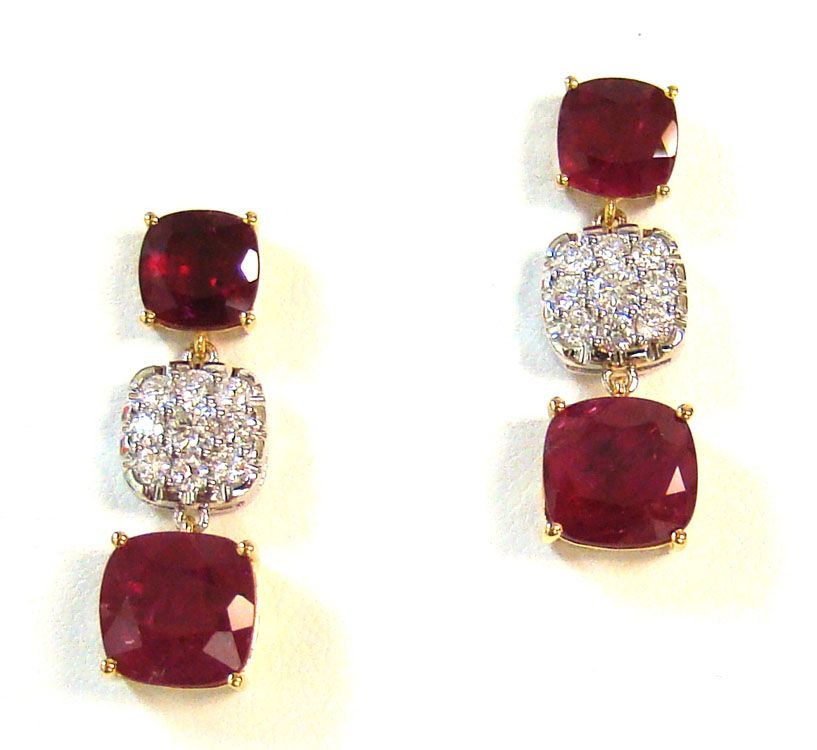 Burma Color Ruby no glass filled Cushion Ruby 11.47ct, Round Diamond 1.04ct, 18kt Yellow Gold , Earring Very rare to find matching stone, Estimated Appraisal Value $100,000
