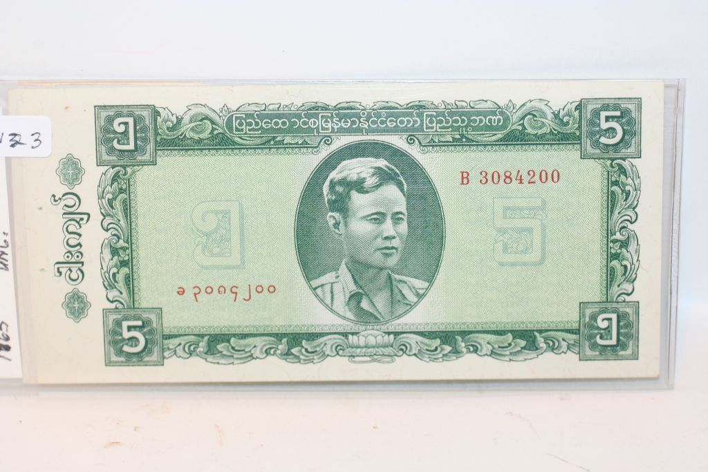 This lot is a 1965 burma (myanmar) 5 kyats note