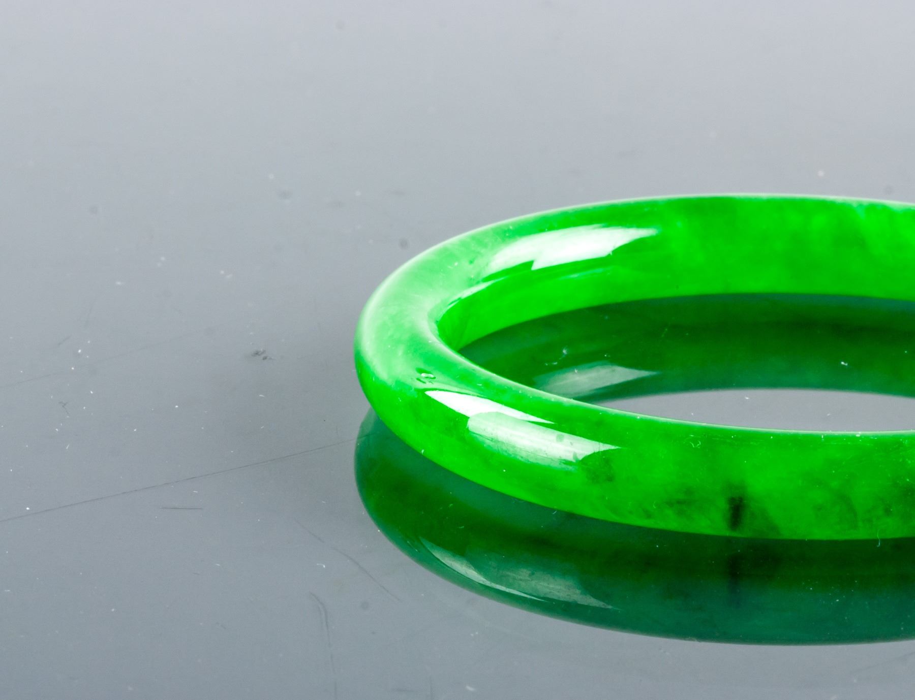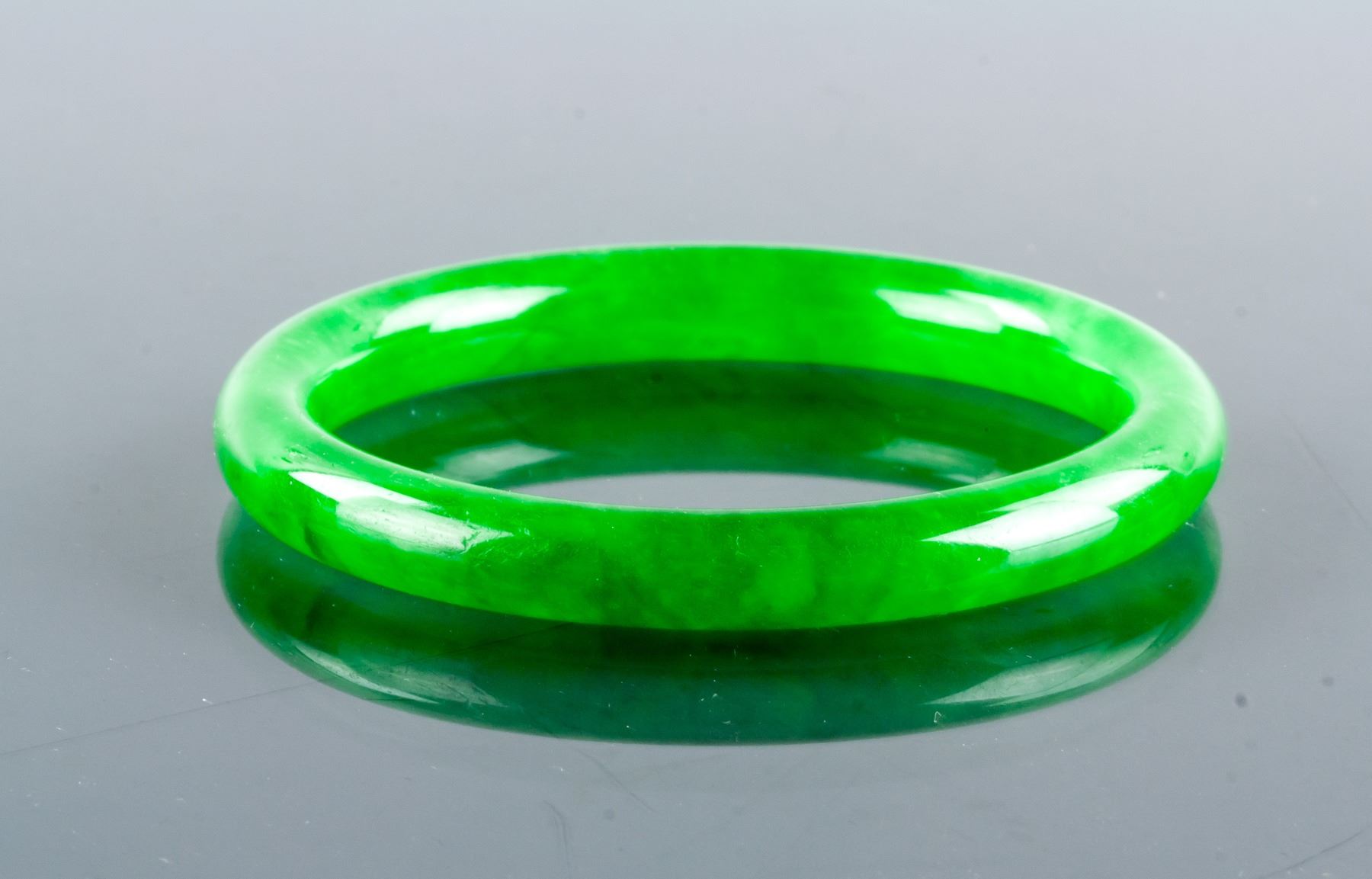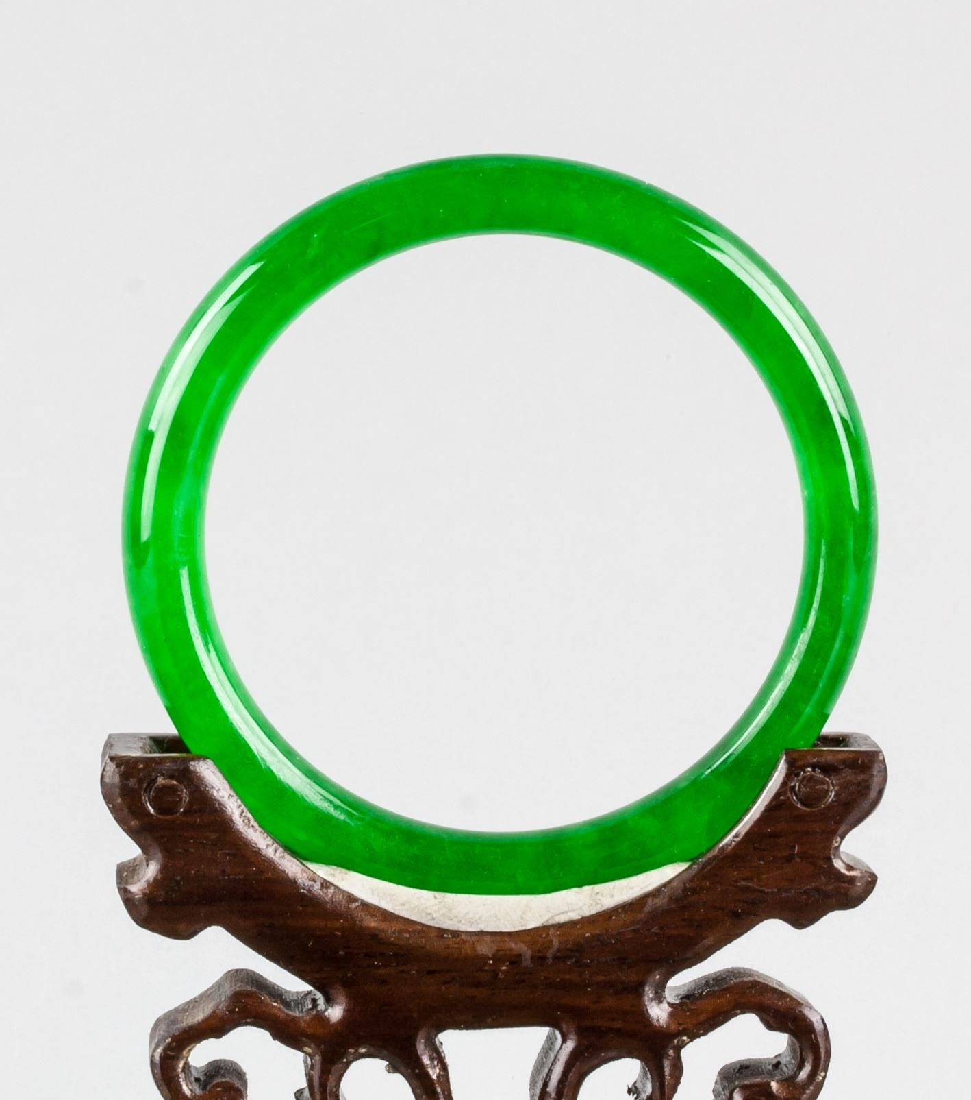 Burma green jadeite carved bangle; of rounded outside and inside; of emerald green tone; Outer Diameter: 7.5 cm, inner diameter: 5.9 cm, 41 grams, Density: 3.30