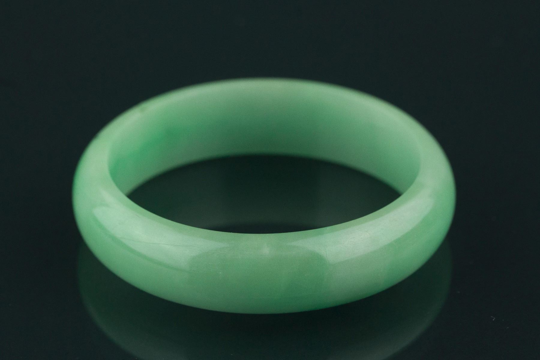 Burma fine jadeite bangle; rounded outside and flatten inside; of pale celadon tone; Inner D: 5.8 cm, 54 grams, Density: 3.29