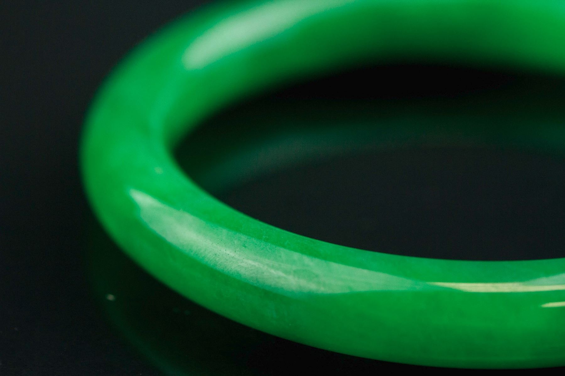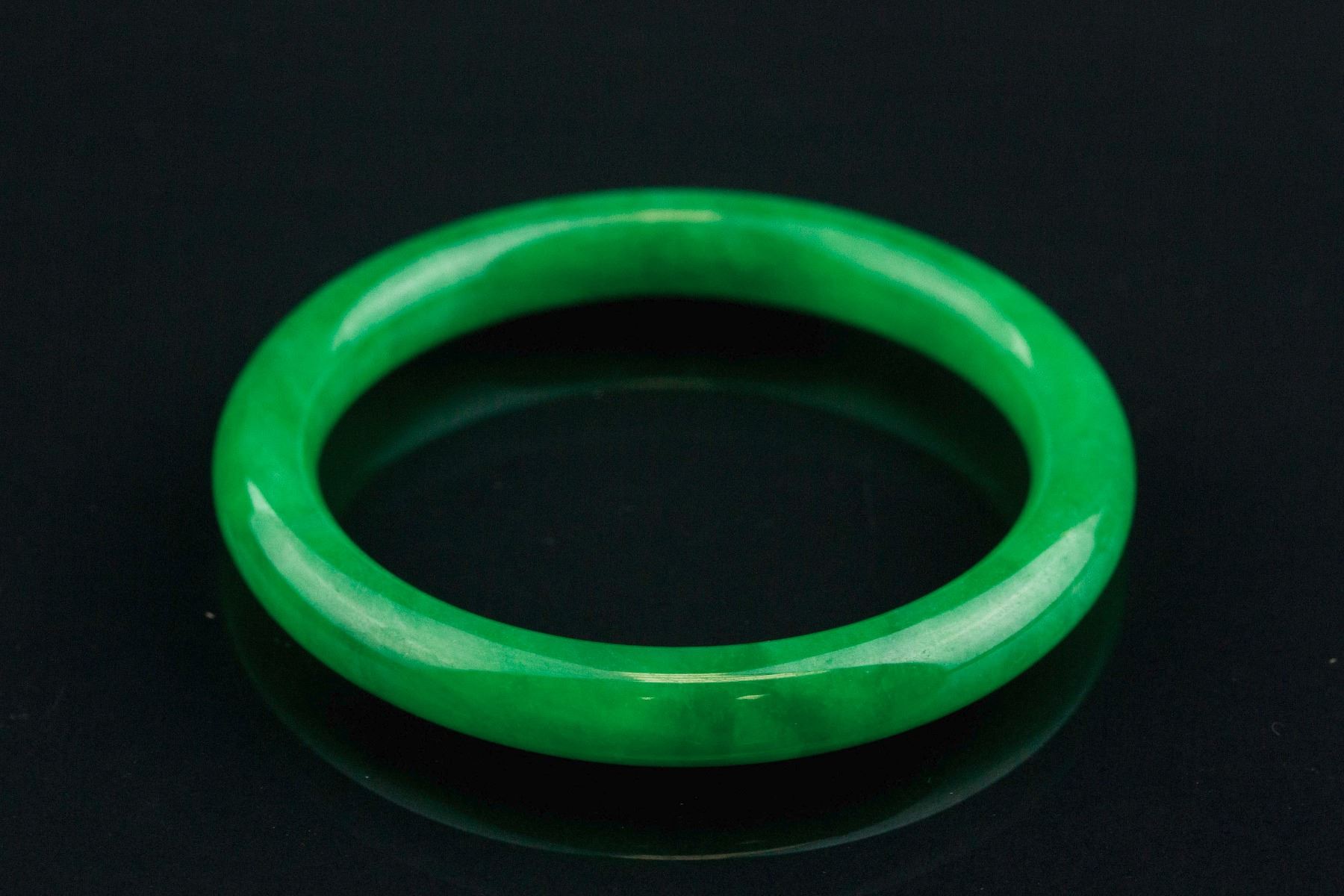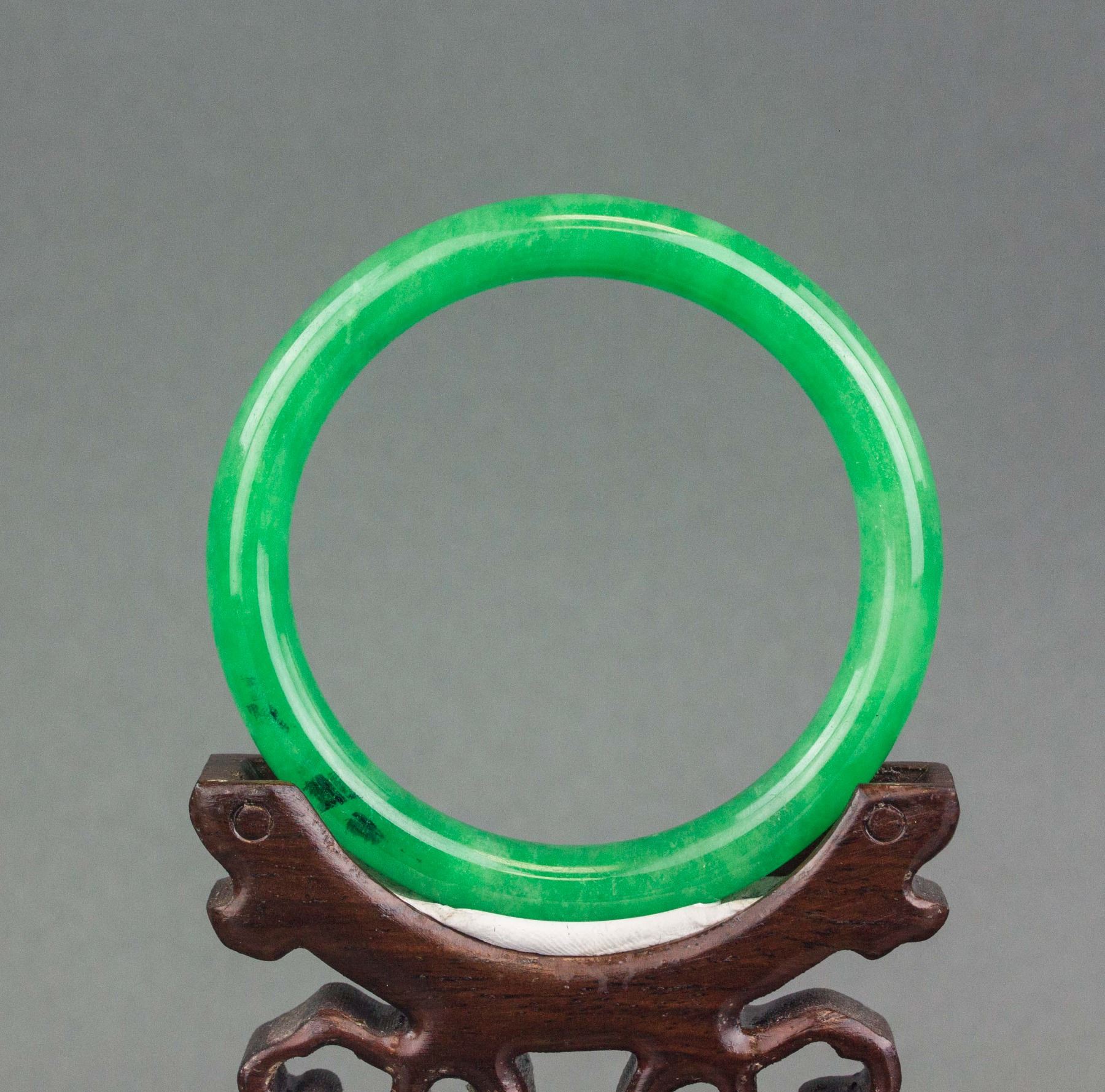Burma fine green jadeite carved bangle; of rounded outside and inside; of emerald green tone; D: 6 cm, W: 0.9 cm, 46 grams, Density: 3.30