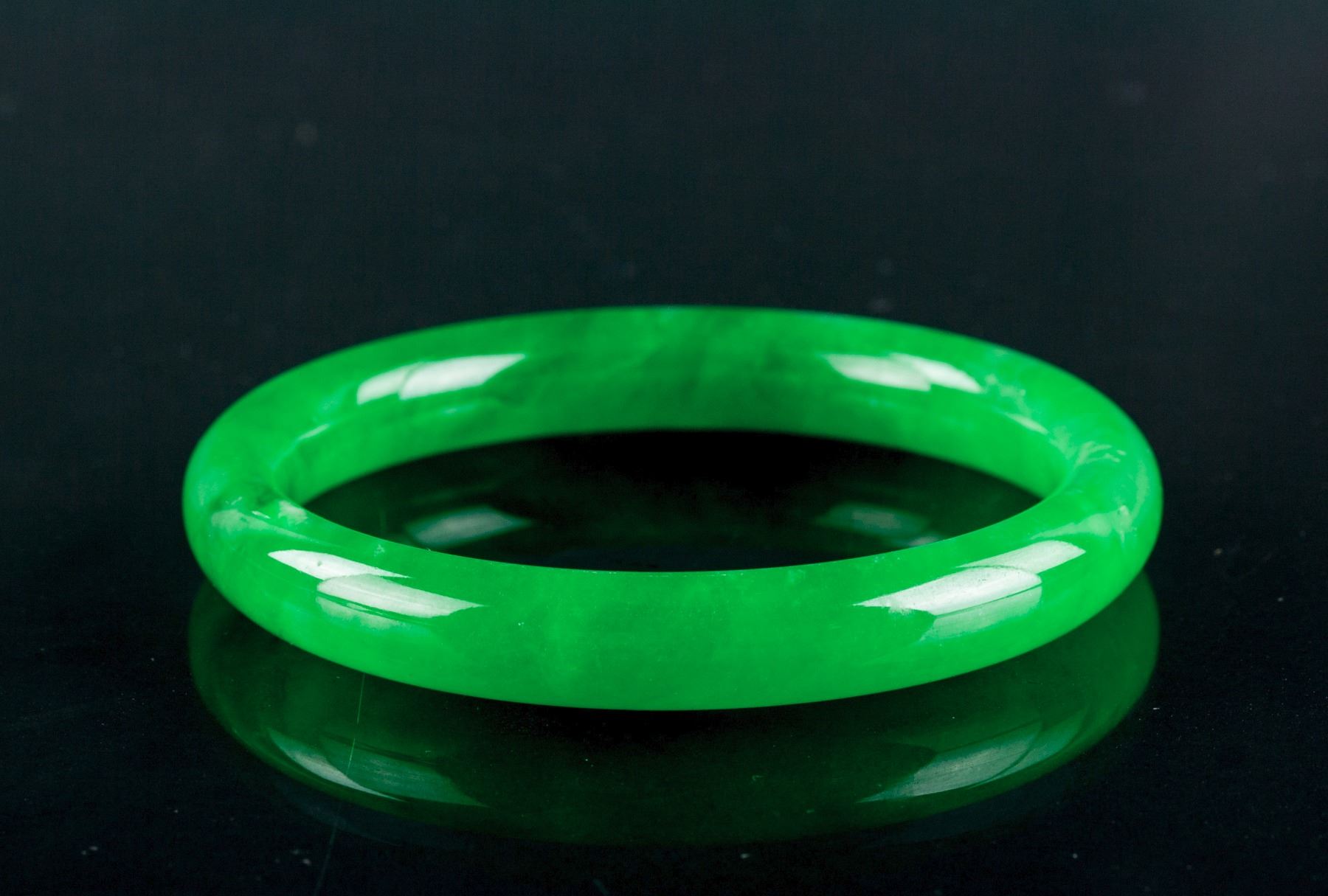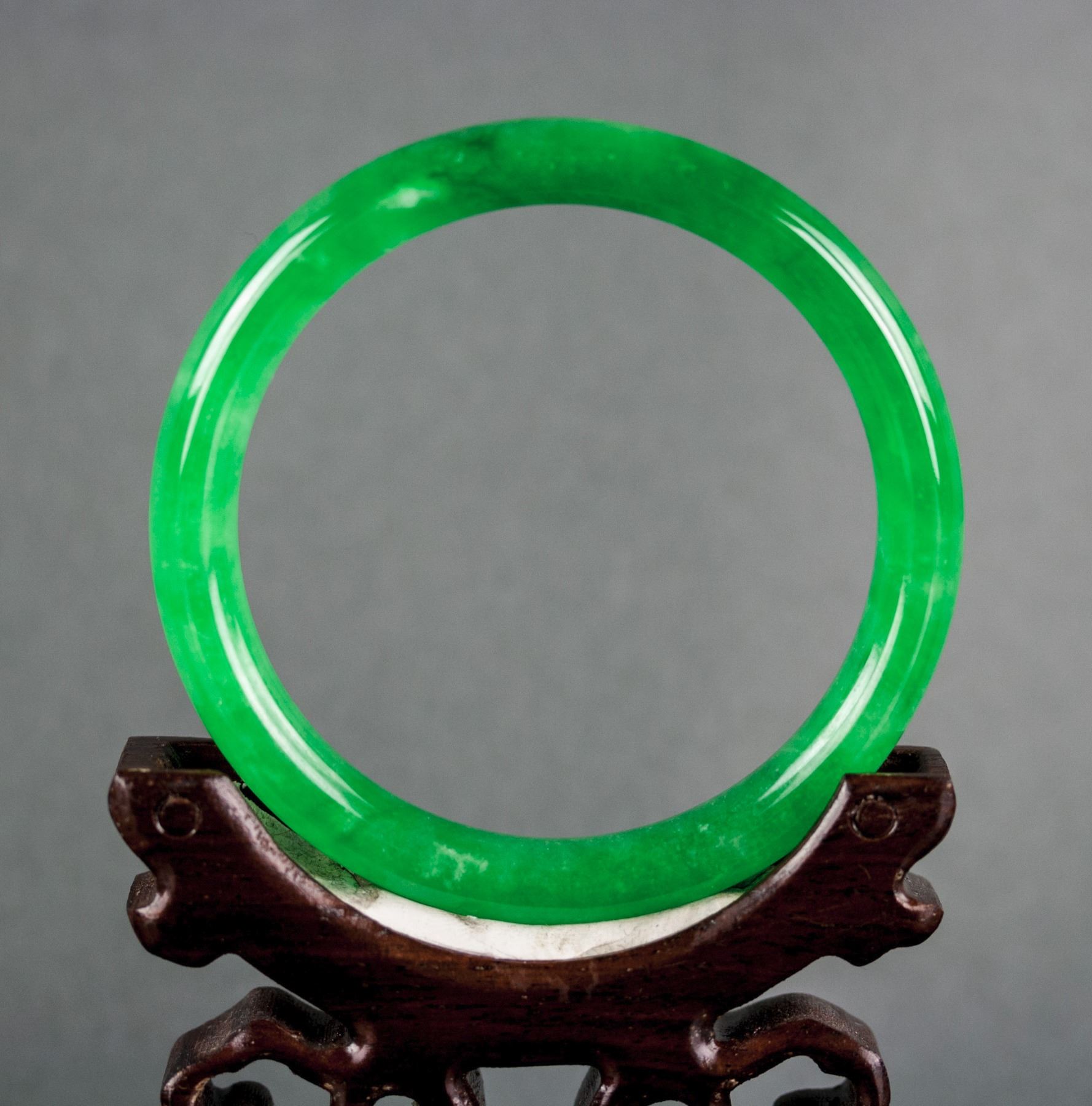 Burma fine green jadeite carved bangle; of rounded outside and inside; of emarald green tone; ID: 6.1 cm, OD: 7.5 cm, T: 1 cm, 45 grams, Density: 3.30