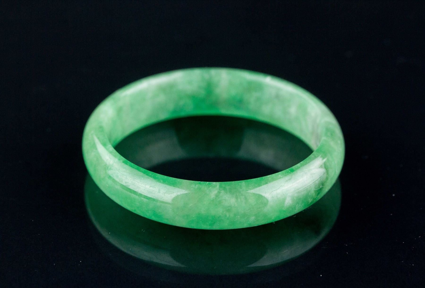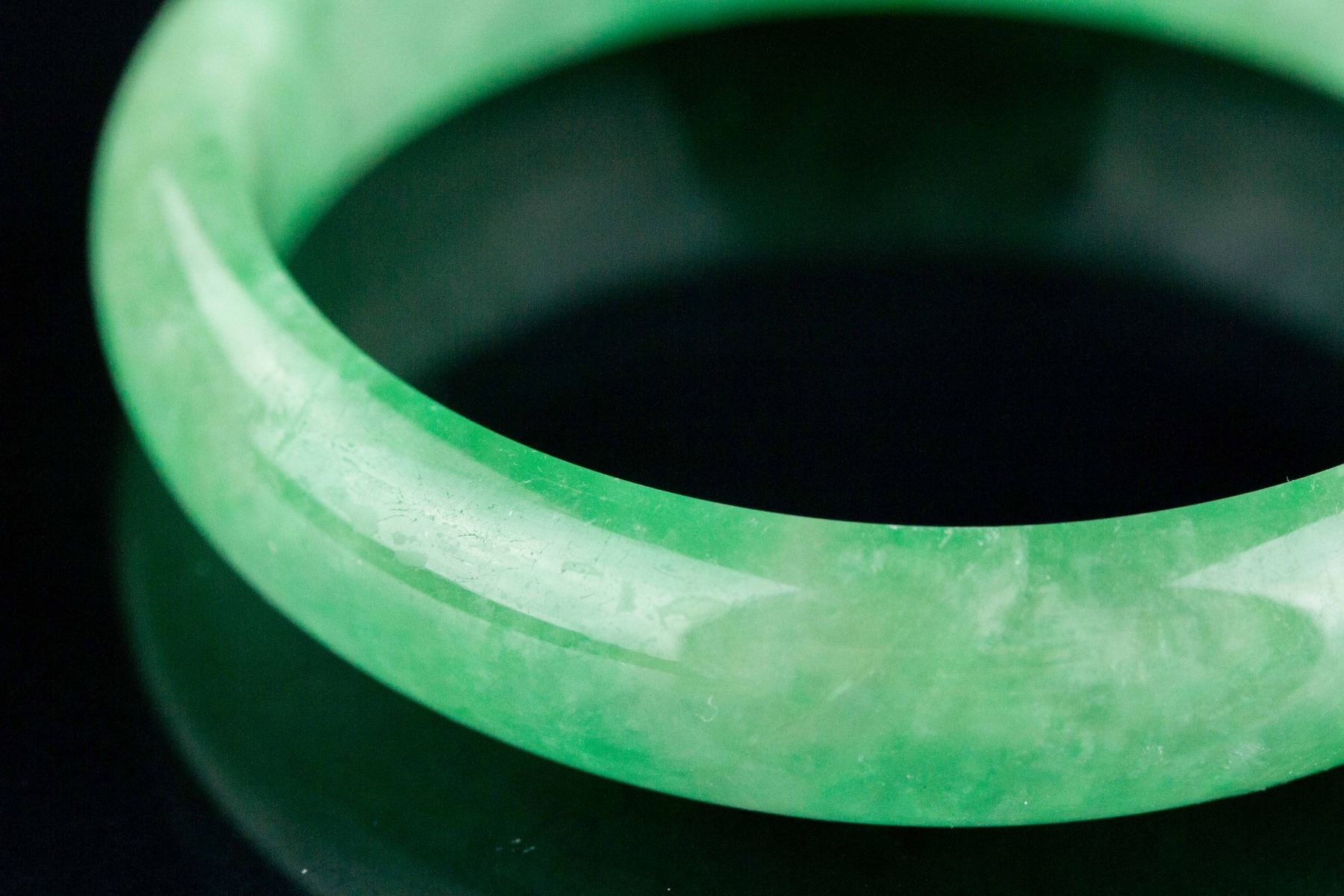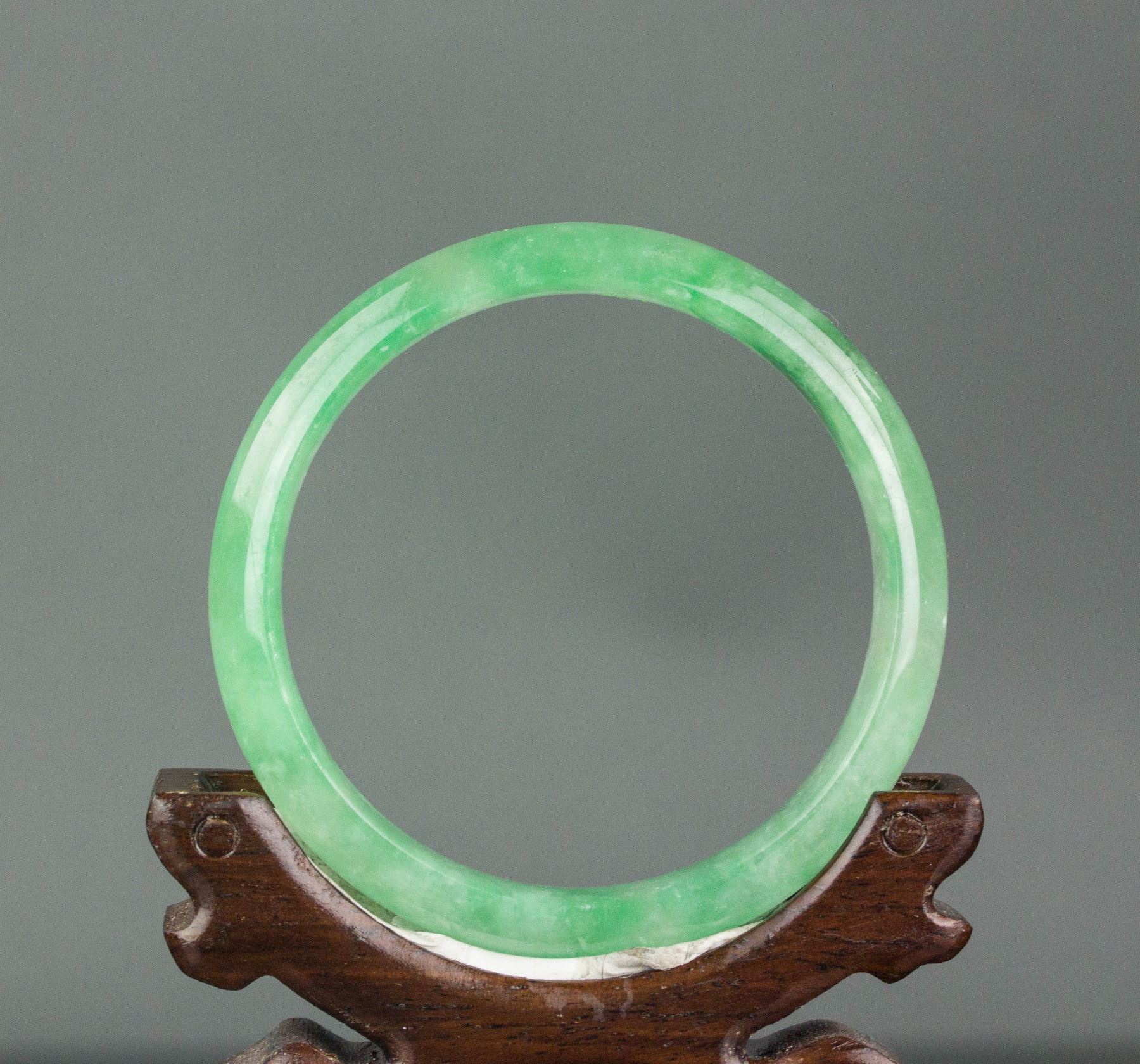 Burma fine jadeite carved bangle; of rounded outside and flatten inside; of apple green tone; Thickness: 1.2 cm, D: 7 cm, 47 grams, Density: 3.32